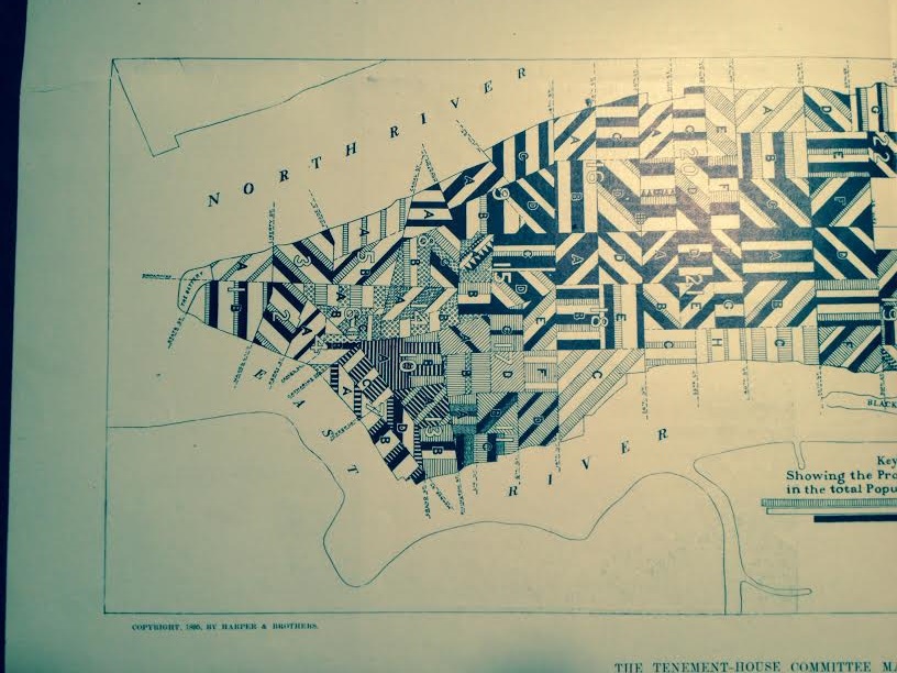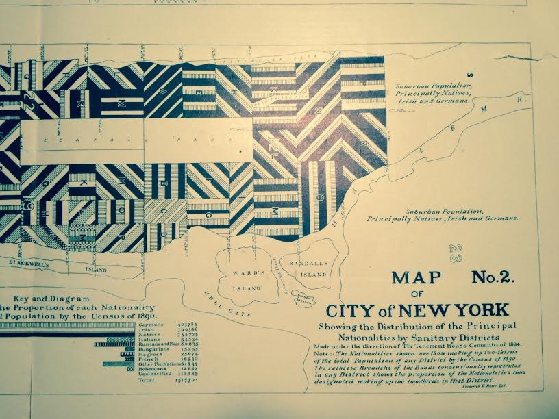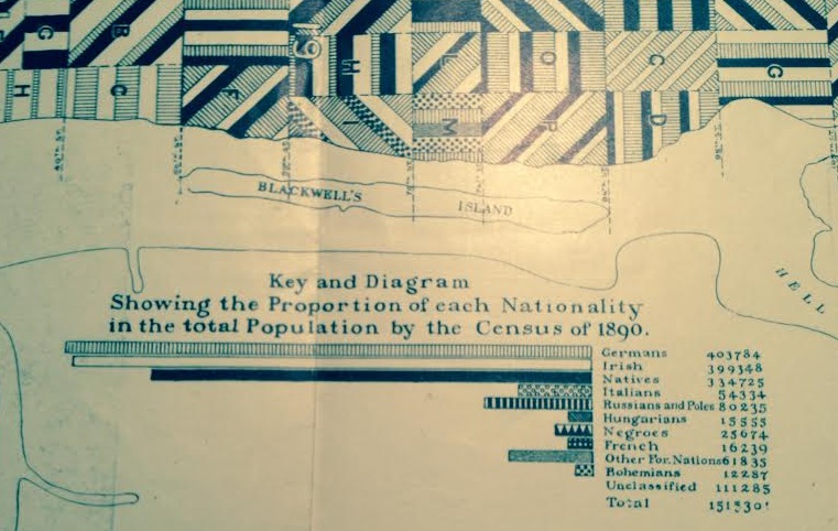 There's a significant amount of crowded, complex information exhibited here, some somewhat more successfully than others. The population density map is pretty straightforward. The distribution of nationalities, however, is another story--there are eleven groups followed here, each given a bit of a confusing flavor, given that the representations are done in black-and-white. Its difficult data to present, especially considering that the groups shown could vary block-to-block, and that the population of Manhattan at the 1890 showed 76% with foreign-born mothers and 40+% of the city foreign-born themselves. (It should be noted that only the groups with 2/3 of the base of any particular zone has been plotted.)