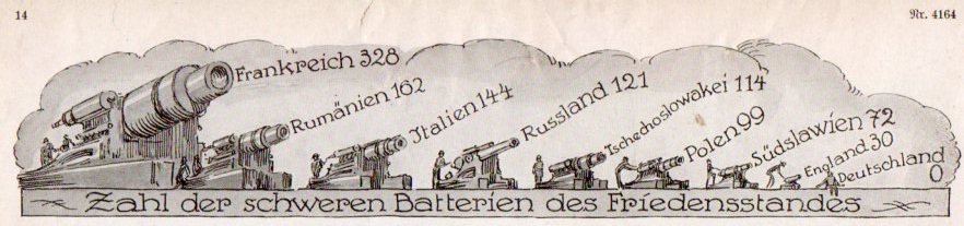 By 1928 Germany was certainly having multiple regressive thoughts about the Treaty, and public demonstrations of questioning its efficacy began to appear with more frequency. In this example--from the Illustrite Zeitung (Leipzig)--a strong statement was graphically displayed showing the state of the German military situation. As you can see, there is scant measurement for just about anything in the military sphere for Germany--and to press the matter home ever more so, in addition to the nulls and tiny numbers, there (in the sixth section down, and magnified above) is a helmeted German soldier with a large magnifying glass inspecting the German totals of the nearly-invisible machine gun totals.