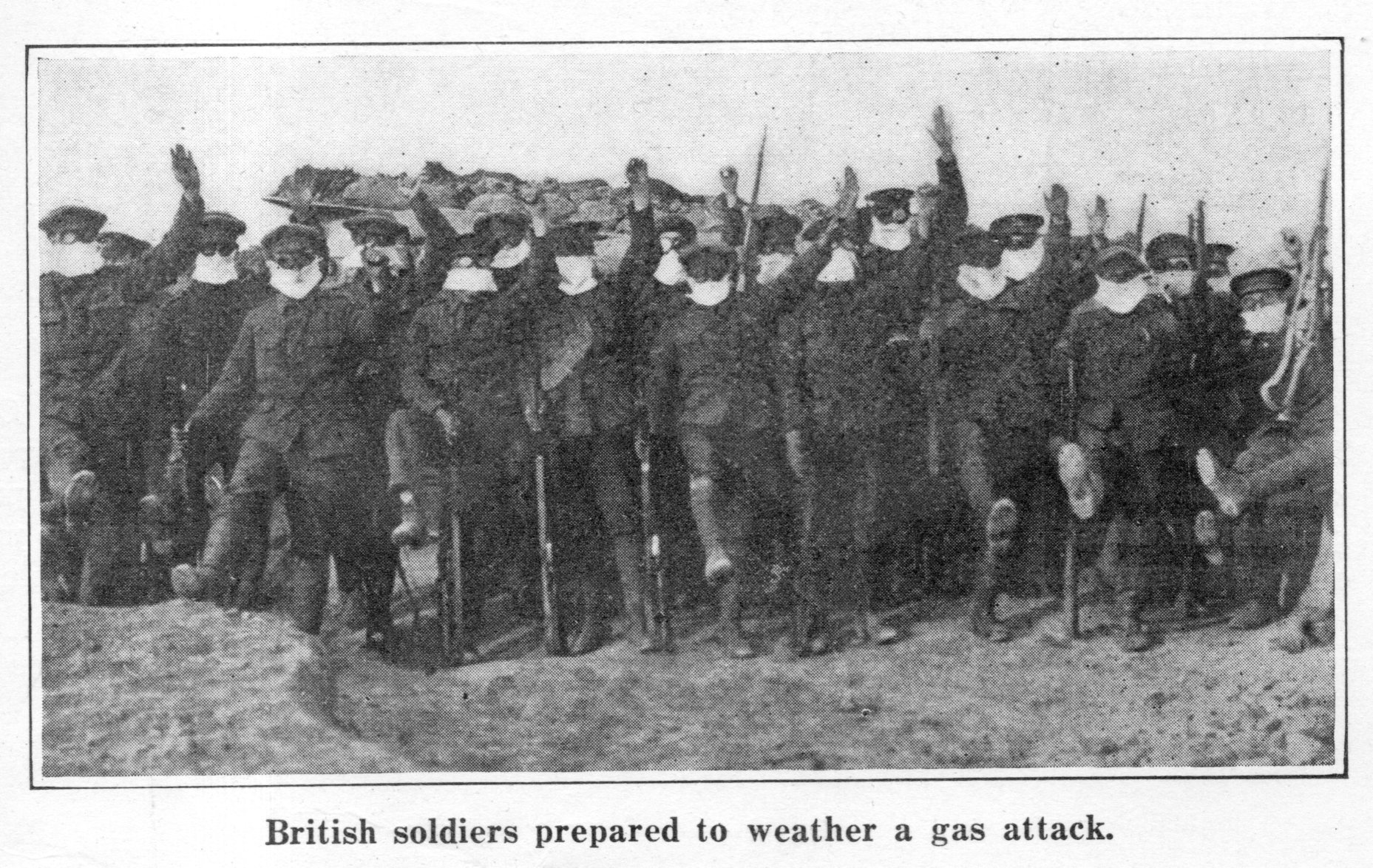 It was the illustrations that stopped me in the Scientific American article--first for the flannel muzzle mask (above), which made my heart half-break; and then, just beneath that picture, a portrait of a group of British soldiers wearing cloth masks, who were "prepared to weather a gas attack". They were told that adding a little water to the mask would help stop the gas, a lot of which was hopeful expectation and wishful thinking.
