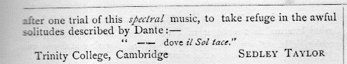 The experiment occurs as a sidelight to a very interesting and very early article by Sedley Taylor, "Analogy of Colour and Music", found in Nature, volume 2, February 24, 1870, in the letters to the editor section, p. 430. His work on analogy in music and color is very early, particularly by someone who was conversant in both worlds. (Taylor would translate von Helmholt's great work on the sensation of tone into English (On the Sensations of Tone as a Physiological Basis for the Theory of Music, publishing it in 1875.) Also in 1875 Taylor published his work on the color/sound subject in a book, Sound and Music. According to Cyril Rootham (1920):