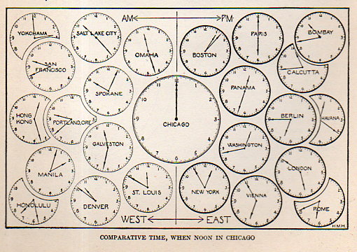 I'm including an example of these images that doesn't work and seems intellectually jiggly to me--it is fairly obscure and meant to clue in schoolkids to the practice of time difference from palce-to-place, and found in The New Practical Reference Library (1912).