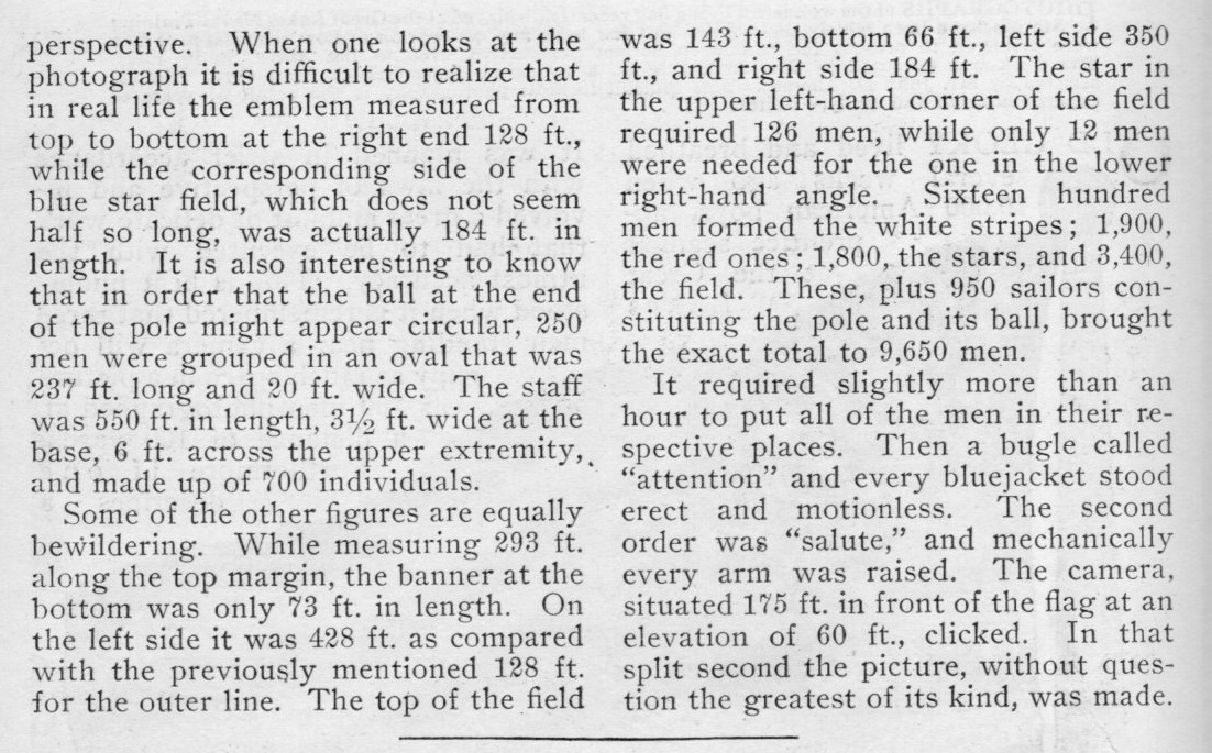 This is an interesting display of perspective found in the article "How Colossal Living Flag was Built", in Popular Mechanics, volume 20, 1918, pp 177-8.