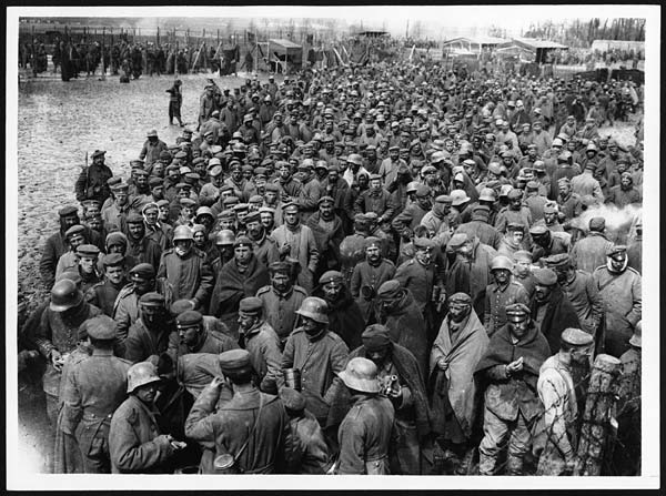 "German prisoners of war waiting in the 'cage', France. The sheer mass of confined, bored humanity evident in this image is quite overwhelming. The evidence of blankets and mud here, suggests that conditions as a prisoner of war were no worse and no better than those of the average soldier in his trench. John Warwick Brooke is thought to have taken this rather bleak photograph. Lance-Corporal Thomas Owen was taken prisoner on the Givenchy Road in April 1918 and he describes the equivalent German experience, 'I left that charnel house [hospital] for the near-by prisoners' cage, where I was questioned and had my papers examined and my letters from home confiscated'. [Original reads: 'OFFICIAL PHOTOGRAPH TAKEN ON THE BRITISH WESTERN FRONT IN FRANCE. Some of our latest bag in prisoners.']"