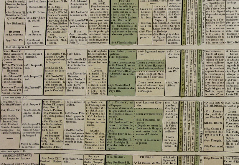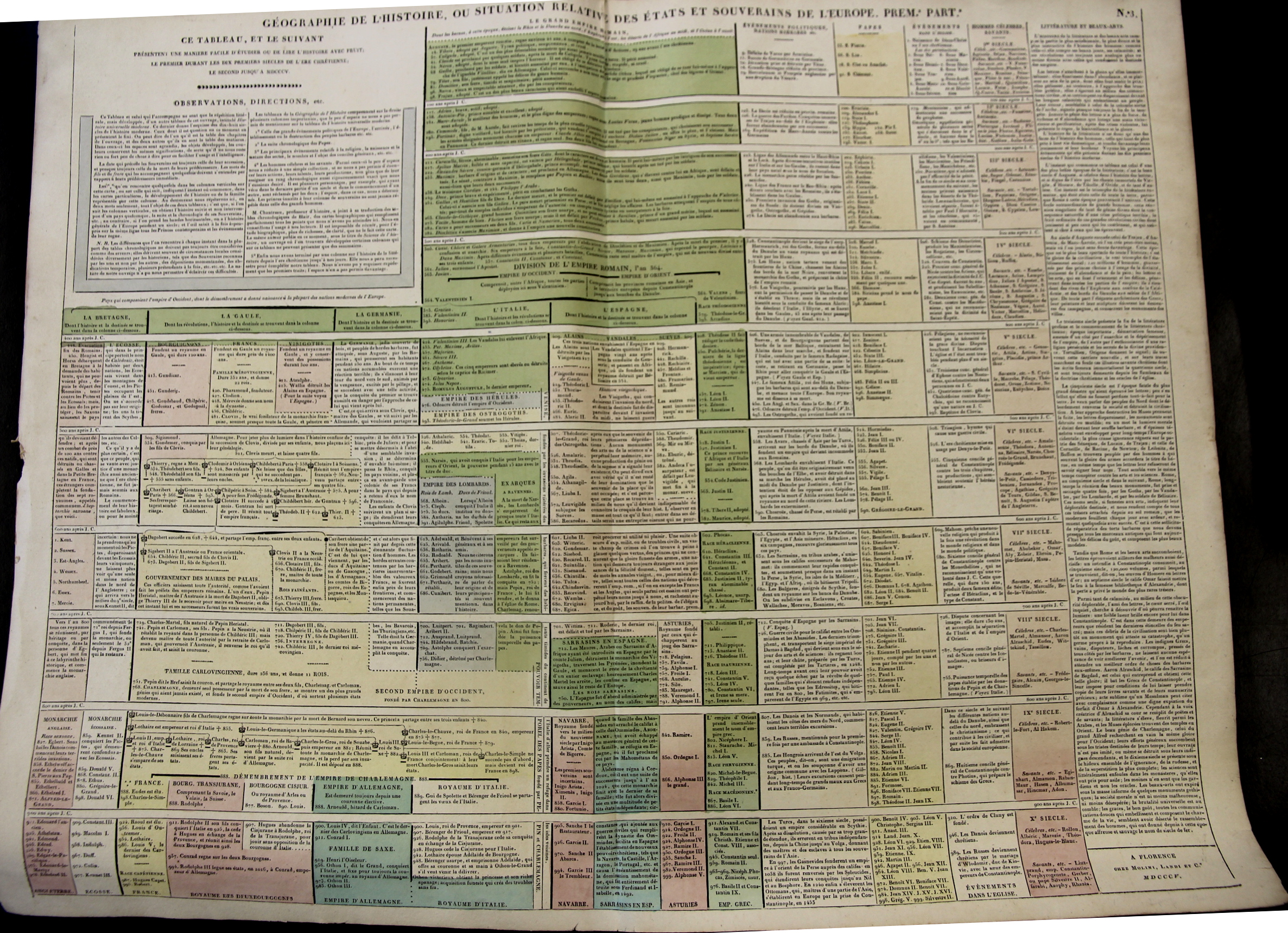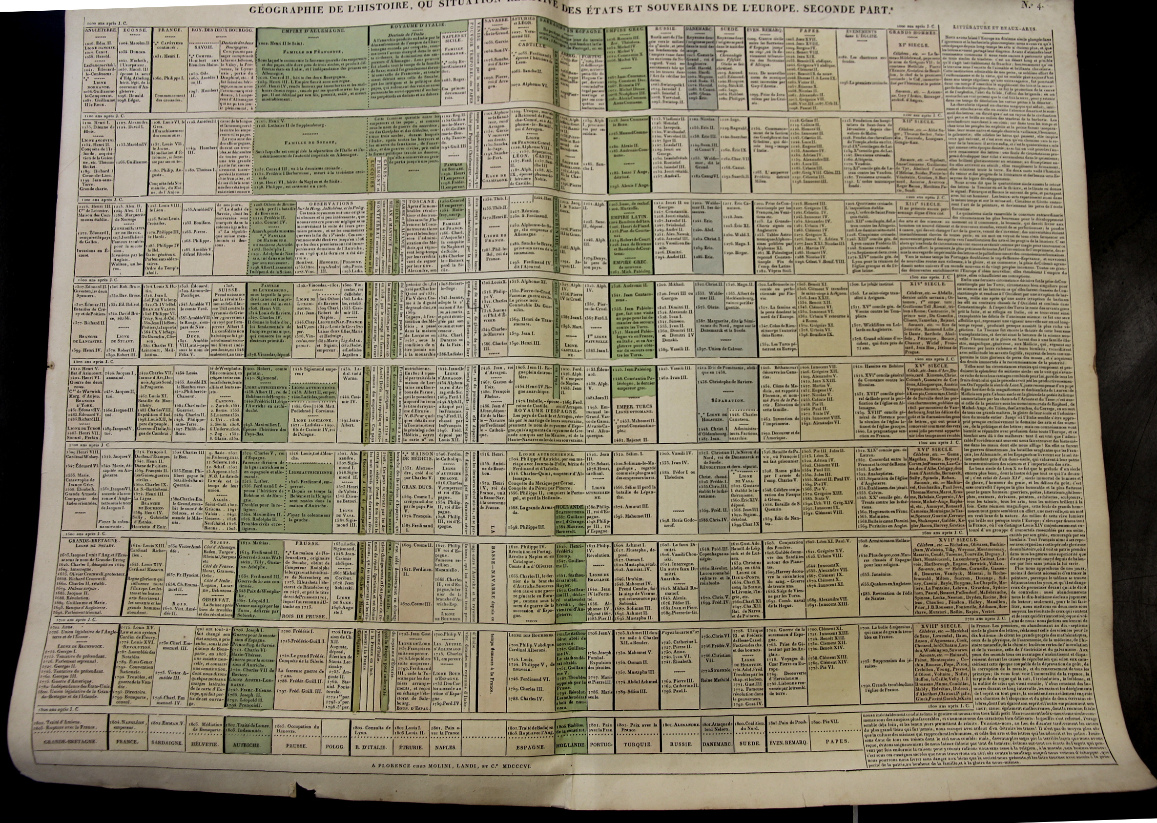Starting at the year 14 (ACE) with the reign of Augustus Caesar this large two-sheet chronology organizes the rulers of the Western world so far as it was known into the early 19th century. ("Geographie de l'Histoire. ou Situation Relative des Etats et Souverains de l'Europe (in two parts), published by Molini and Landi, in Florence, in 1806.) There are 15 major divisions from the year 400-1800, with a short bit at the top of the first chart covering the previous 386 years or so. The columns show the rulers of reach century for Britain, France, Germany, Italy, Spain (then subdividing as necessary). There is one column for the "nations barbares" that covers everyone else in about 2" per century; there is another column for the chronology of Popes; one column for a general history of the Christian church, one column for celebrated and famous people, and then a final column for literature and the arts.