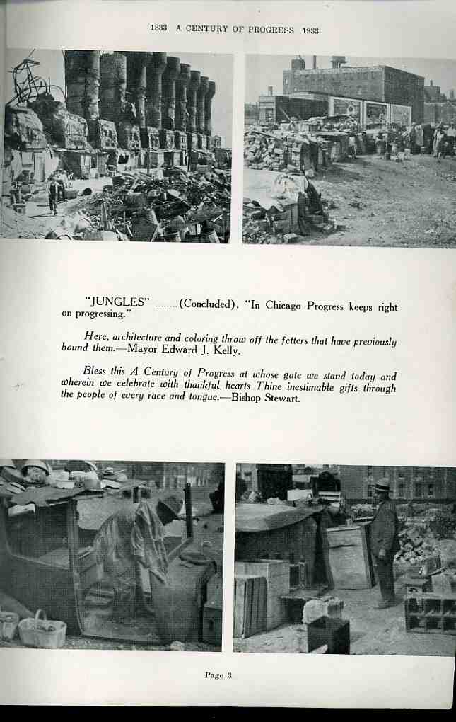 Duncan addressed the work directly to the Rufas Dawes (President of the Century of Progress Celebration), and to the mayor of Chicago and governor of Illinois as a very blunt request to not forget the actual world of real Chicagoans living in dire straits within site of the fairgrounds. Duncan was obviously taking issue with the many statements of wonderment and flourishes of progress that accompanied the propaganda surrounding the fair, so that the attention of the public would not be "diverted by our political and civic leaders". Duncan continued that these photographs, "none of which had been published previously in the United States" could "perhaps suggest a point of reference from which Chicago can measure its Second Century of Progress".