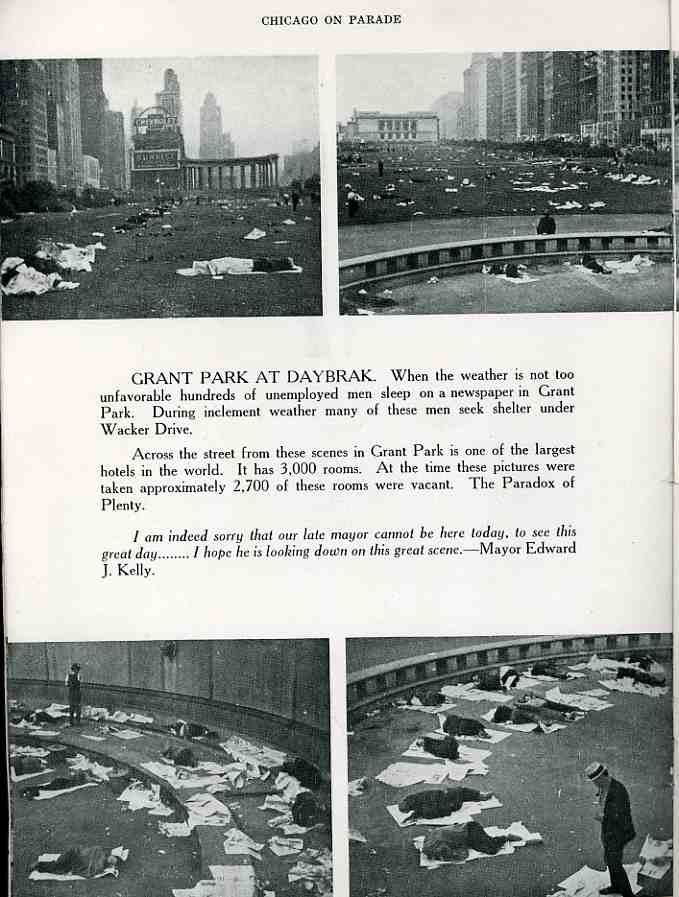 Duncan (who unfortunately did not identify the photographer(s)) was very strong in the use of images. He was not afraid to show long bread lines, people (including children) scavanging at the city dumps, blacks and whites marching together in protest of police brutality, (many hundreds) of people sleeping out of doors in Grant Park (Chicago's "front yard"),because they had no where else to go, and much more. The photographs had a real touch of journalistic acumen, and none of the images look forced or posed--they are the real stuff of social documentary, and how they have escaped wide notice is not known to me