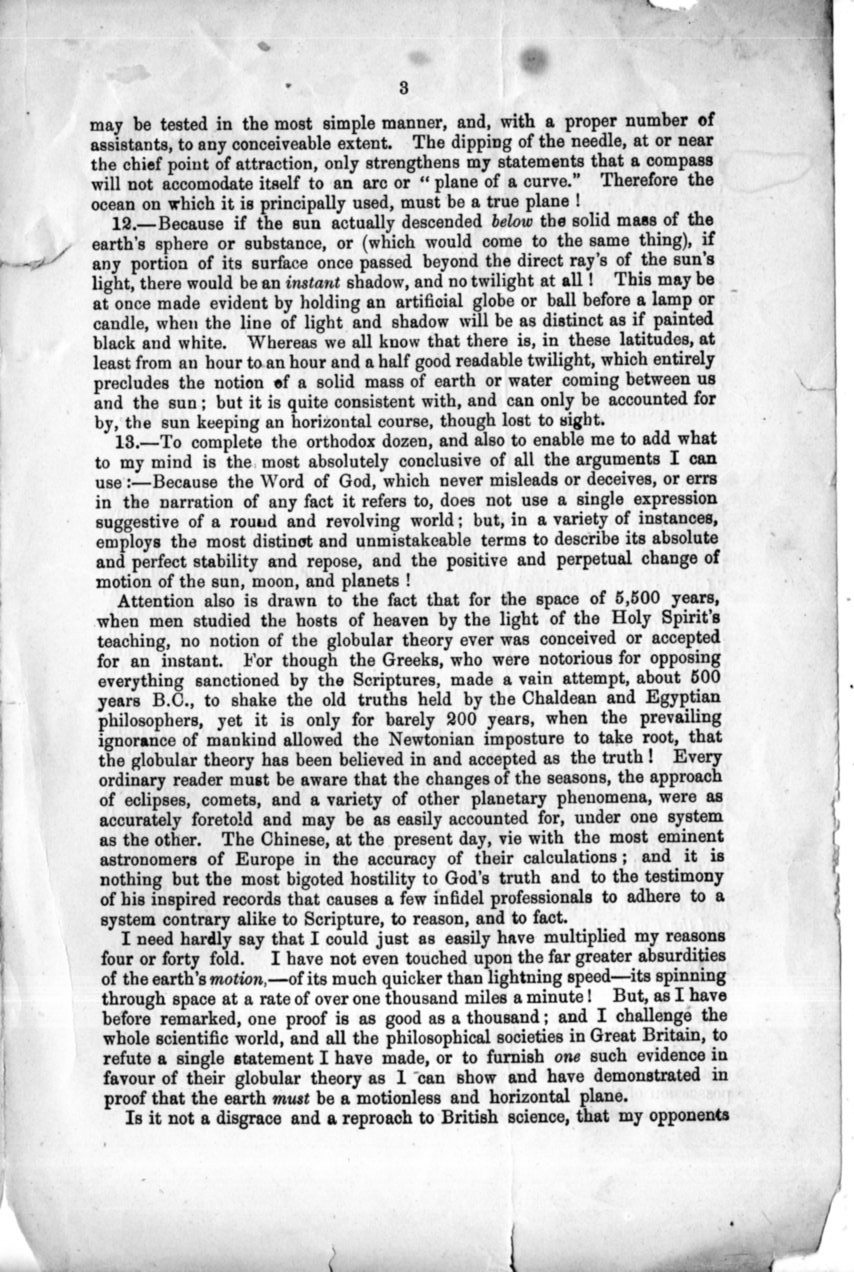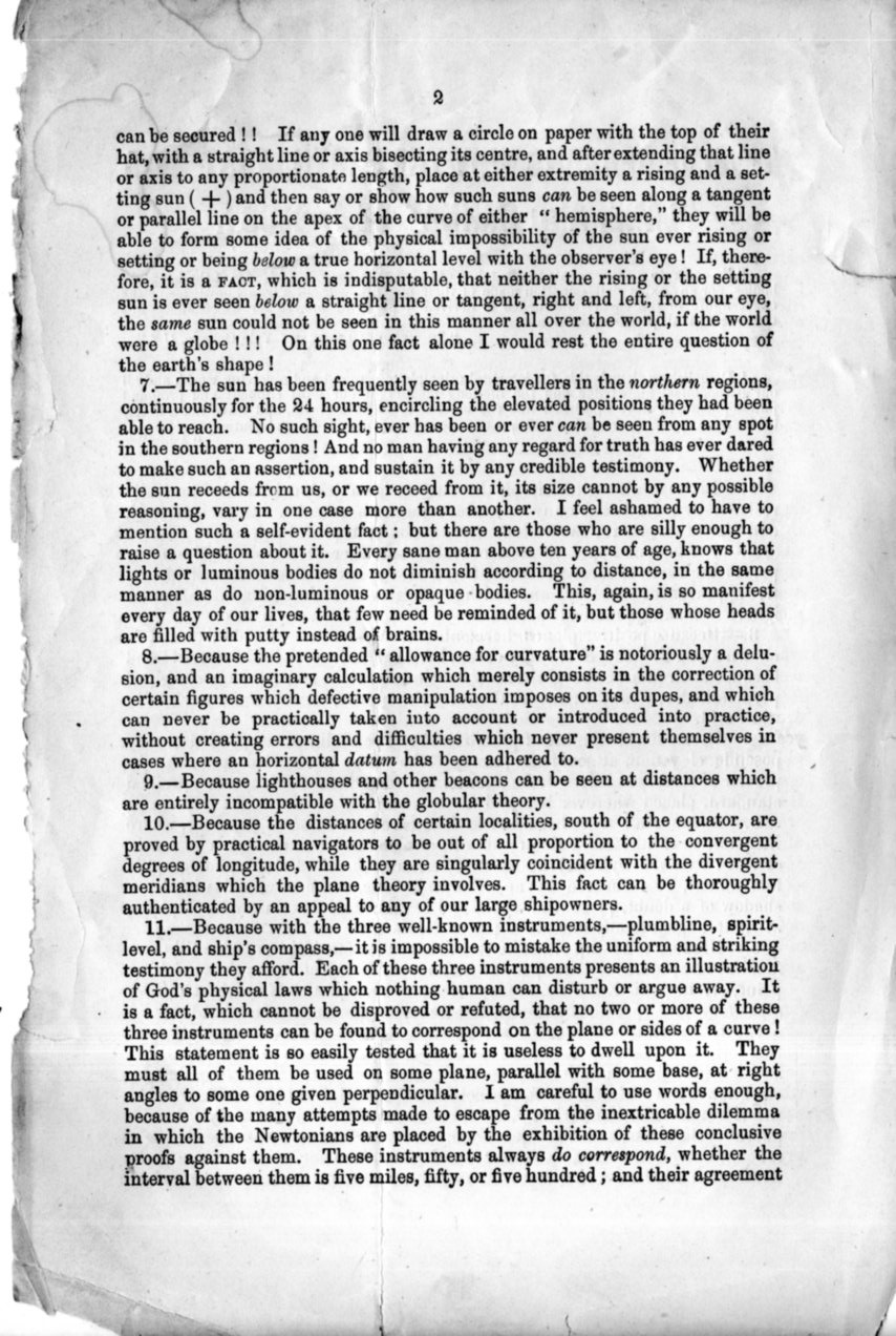 The pamphlet (actually just a folded sheet of paper) was the work of John Hampden, whose name is probably recognizable to those who have read in the swollen knuckle religious/scientific strife literature. He was a long opponent of the Earth as a sphere, basing much of his deep assertions on scripture. Hampden was that terrible mix of unctious and litigious, and fought with folks for decades, most famously with Alfred Russell Wallace, to whom he lost several libel suits costing him money and freedom over the long course of that inextinguishable dumpster fire.