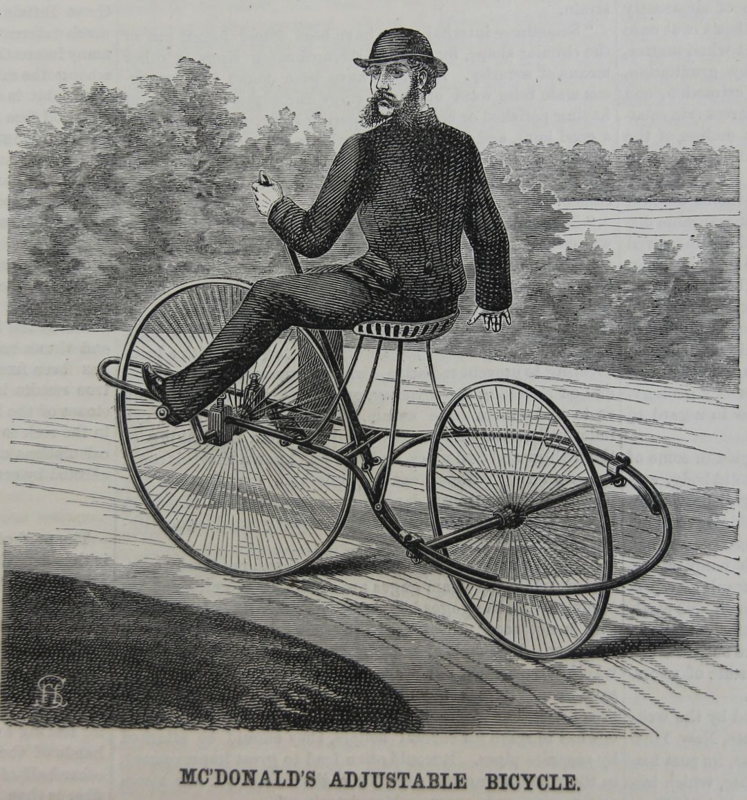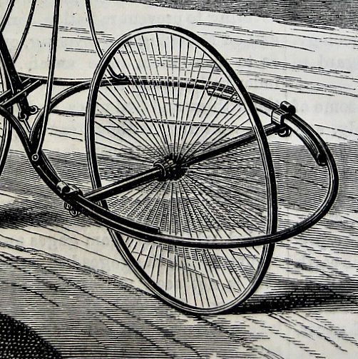 From the Scientific American: "The frame is of hollow pipe the rear being a complete in which the steering wheel rotates on its axis the steering a wheel running between the parallel bars the front portion. The axle of this passes through boxes secured to the bars by screws so it may be adjusted forward or back to suit the physique of the rider. The axle of the steering wheel runs in secured to sliding bars curved to fit the diameter of the circular portion of the frame thus allowing this wheel with its axle to per form an entire revolution within the frame a horizontal plane. Its movements are controlled by means of rods attached at one to he ends of the axle and at the brought together to the lower end of a directly under the rider's seat the handle which comes up in front of the rider the fulcrum being on a cross piece between the portion of the parallel bars serving not that purpose but that of a brace. It will seen from the figure that the guiding of vehicle may be effected by one hand seat need not be so high as represented in engraving it may be lowered until nearly the level of the reach which is the line of the axles."--Scientific American, April 24, 1869, p.264.