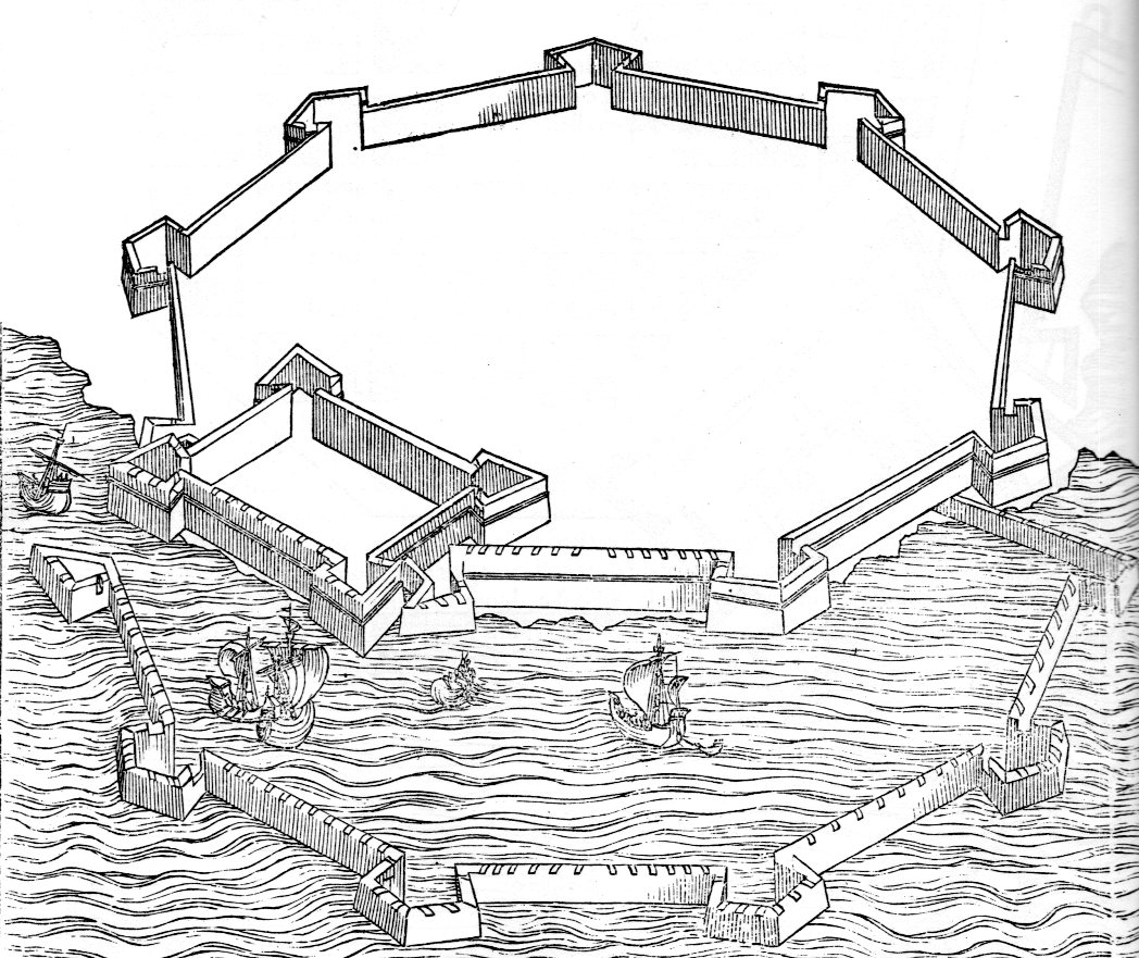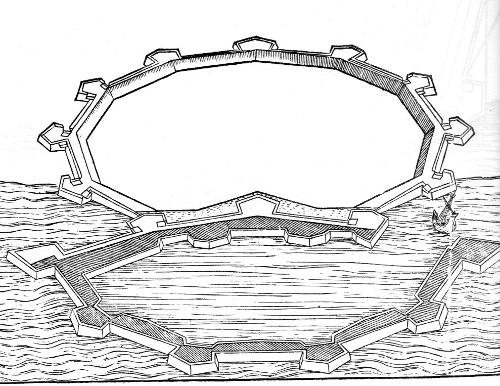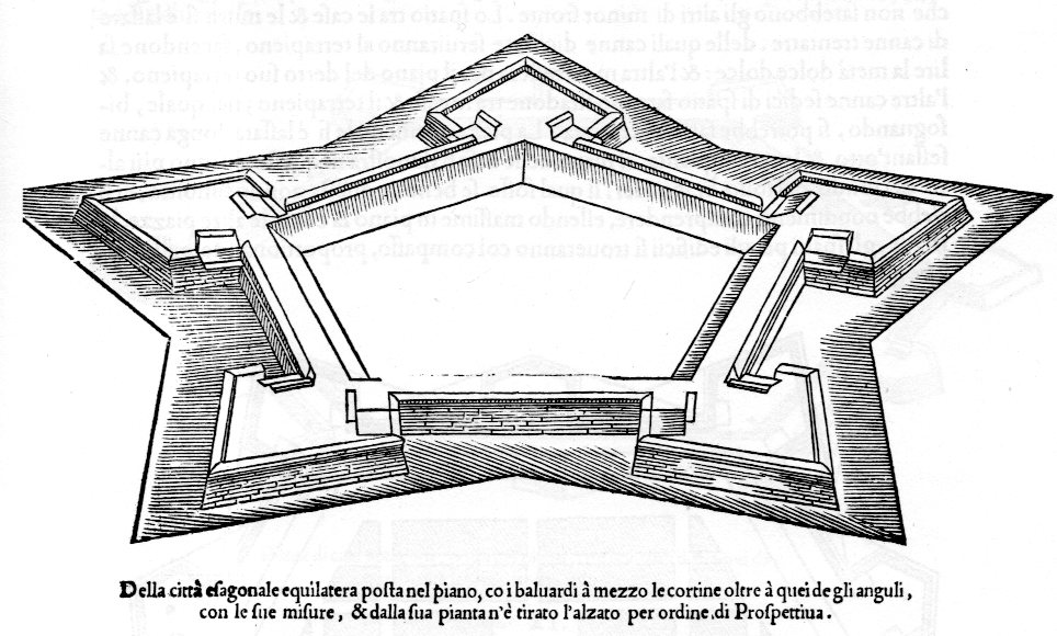 These interesting images of fortifications--protective of nothing, staffed by no one, generally in no landscape--are very lonely design representations found in Pietro Cataneo's I Quattro Primi Libris di Architettura, and printed in 1654. They are forts that protect and capture nothing, at least in this book--they are simply perspectives for fortification design. They float beautifully in the text, lifted somewhat from the pages unencumbered by any human detail.