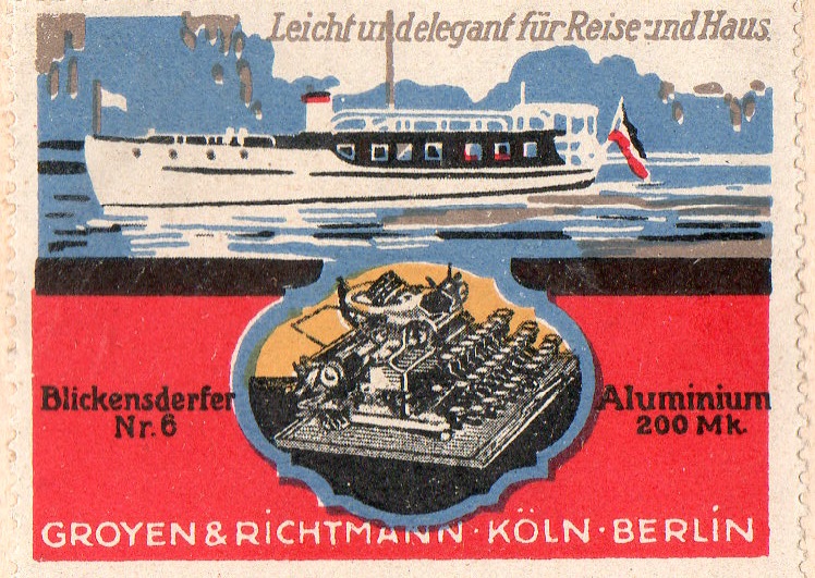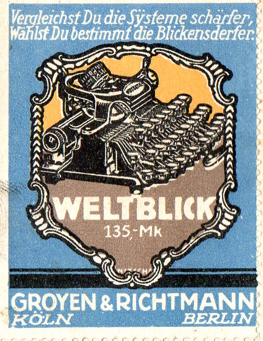 This ad appeared at the top-quarter of a page in Illustrirte Zeitung for July 1914, a month before the beginning of the war--these creative and colorful stamps (each only about one inch tall) were made to attract readers of the weekly magazine to the fine typewriters produced by Groyen & Richtmann of Cologne and Berlin.