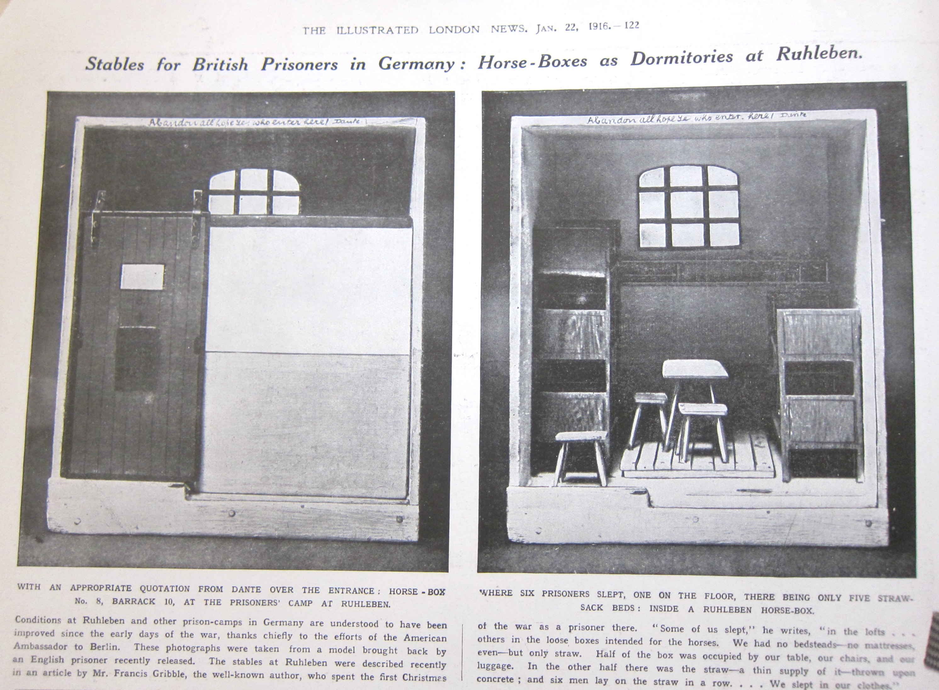 Francis Gribble was an inmate at Barrack 5 in Ruhleben. He wrote a short essay entitled "Leaves From a Ruhleben Notebook" outlining his experiences whilst interned, including the witnessing of a fellow inmate's suicide. This was advertised as being printed within "The Fortnightly Review" of January 1916, the advert appearing in the Times of January 3rd 1916 (p.4, col.B).