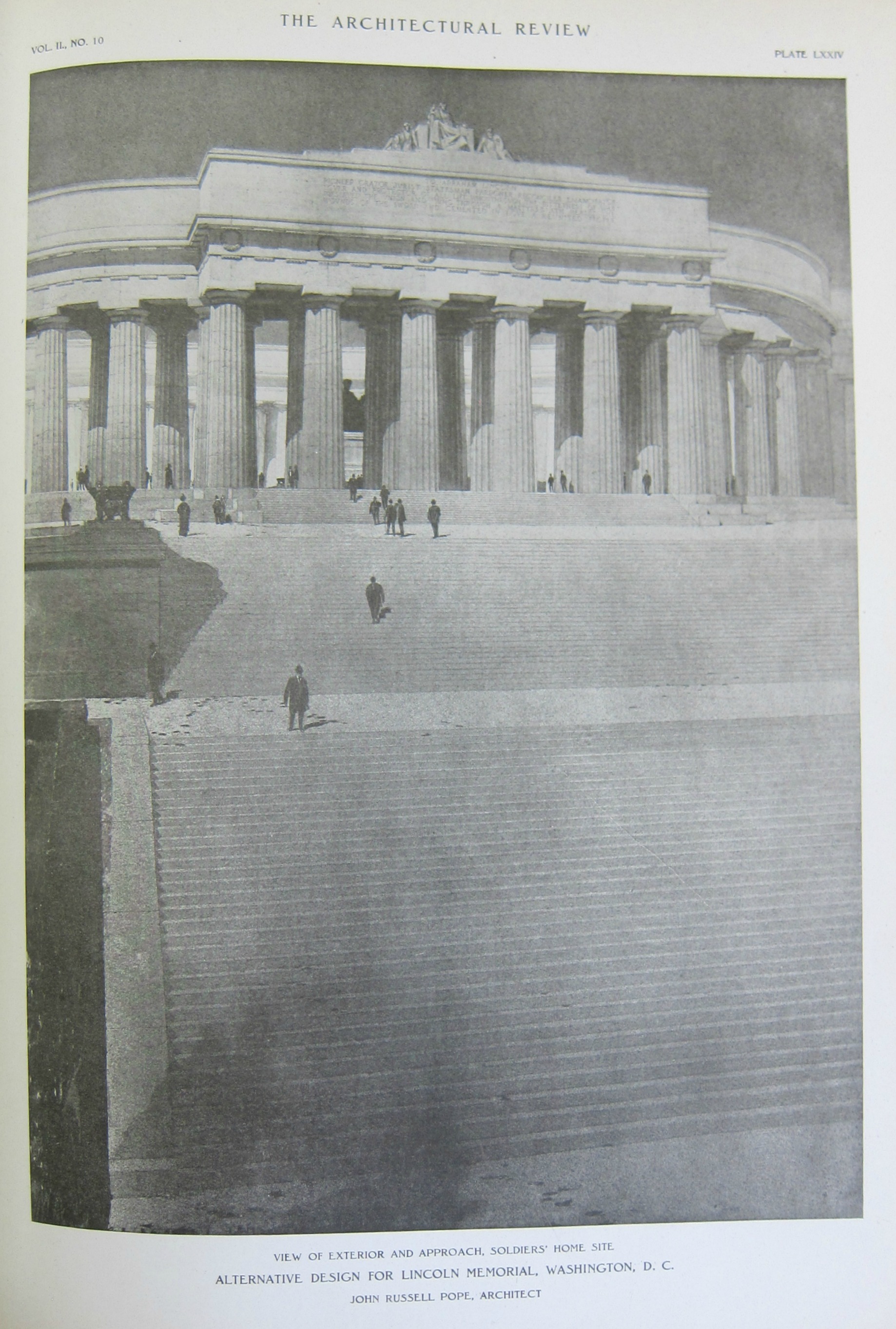 John Russell Pope (1874-1937) was a "classical" Neo-classical architect whose designs had a profound impact on the way that people experience the U.S. past in Washington, D.C. He created the Jefferson Memorial, the National Gallery of Art, and the National Archives, buildings which have that particular beautiful geometry of Roman/Greek essence. The designs that Pope submitted for the Lincoln Memorial, however, are quite a different story. They were magnificent, and gigantic, and in some ways very appropriate given the enormous nature of Lincoln.