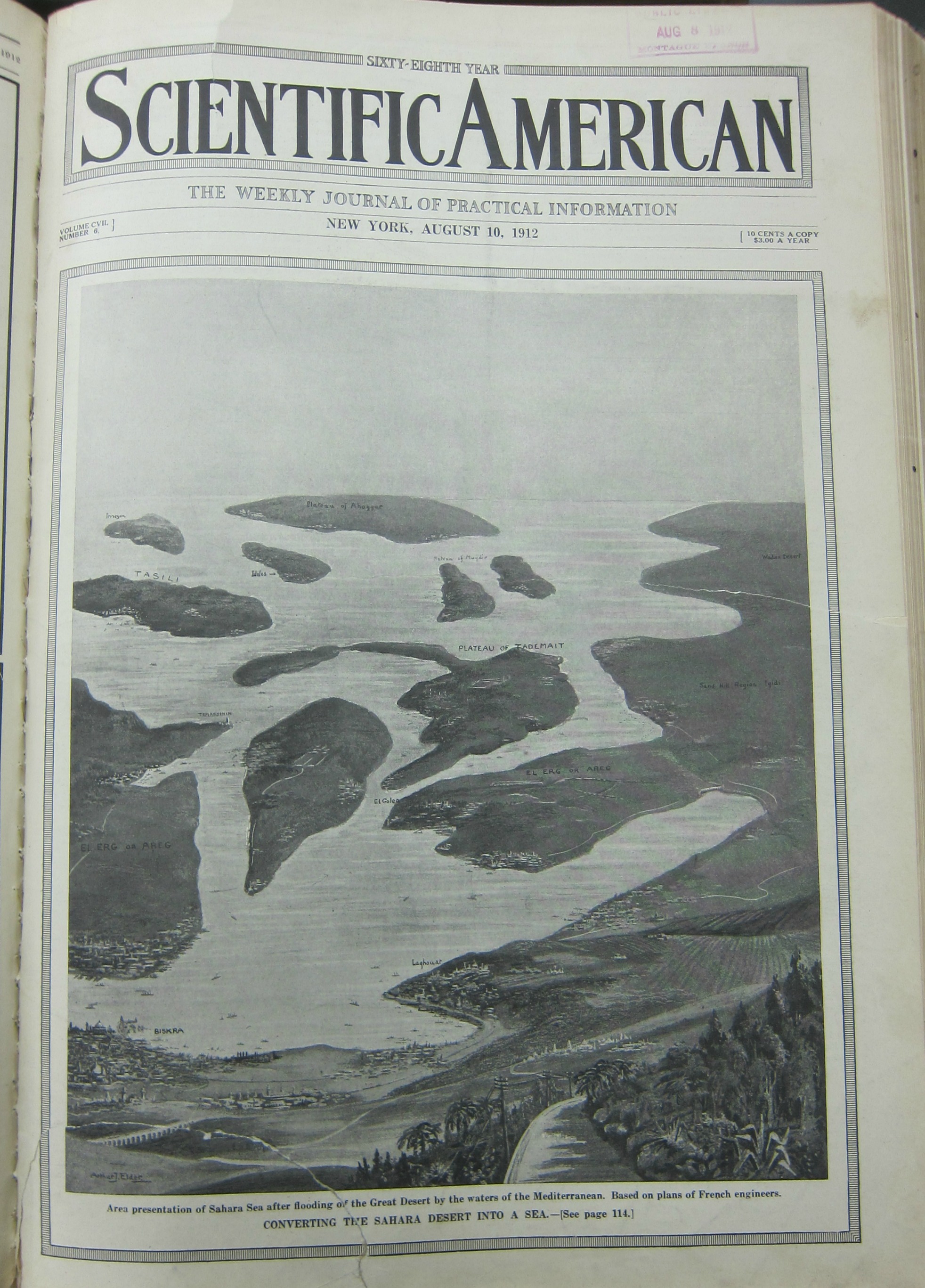 1. "A Plan for Converting the Sahara Desert into a Sea, What Would Happen if the French Flooded the Great Desert", by G.A. Thompson, August 10, 1912, p 114