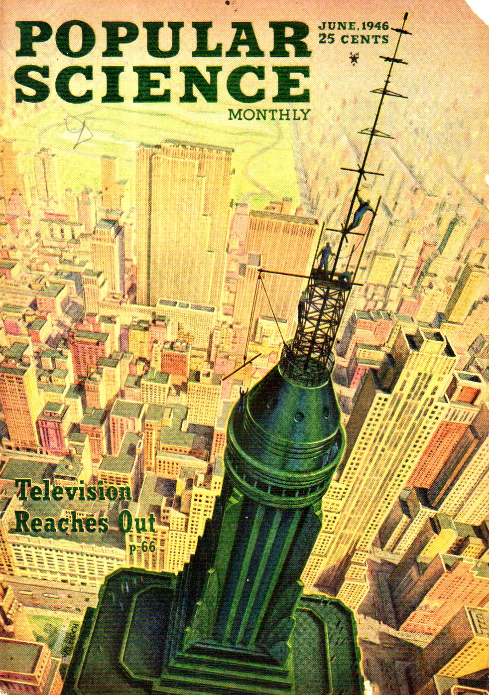 I like this view (Popular Science, June 1946) because of the severely oblique bird's-eye looking down/north on the tv antenna of the Empire State Building, sitting on top of the 102nd floor observation deck. If you look closely you'll see that there's some sort of assembly going on: