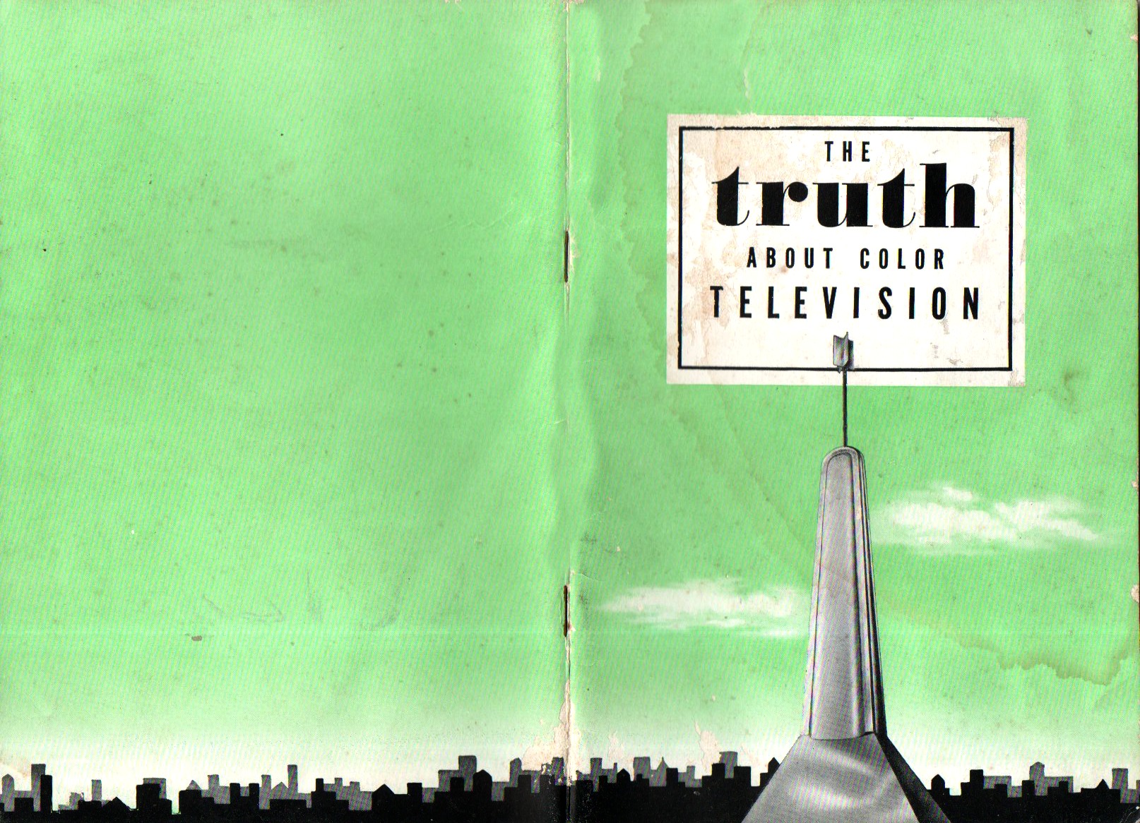 This pamphlet was delivered by Allen Du Mont Labs (1946) with the popular dictum that color television was not only possible but a probable near-term you-can-have-it-now reality. The unfolded pamphlet cover also forms an interesting imaginary green-sky citiscape with a very stubby tv antenna foreground: