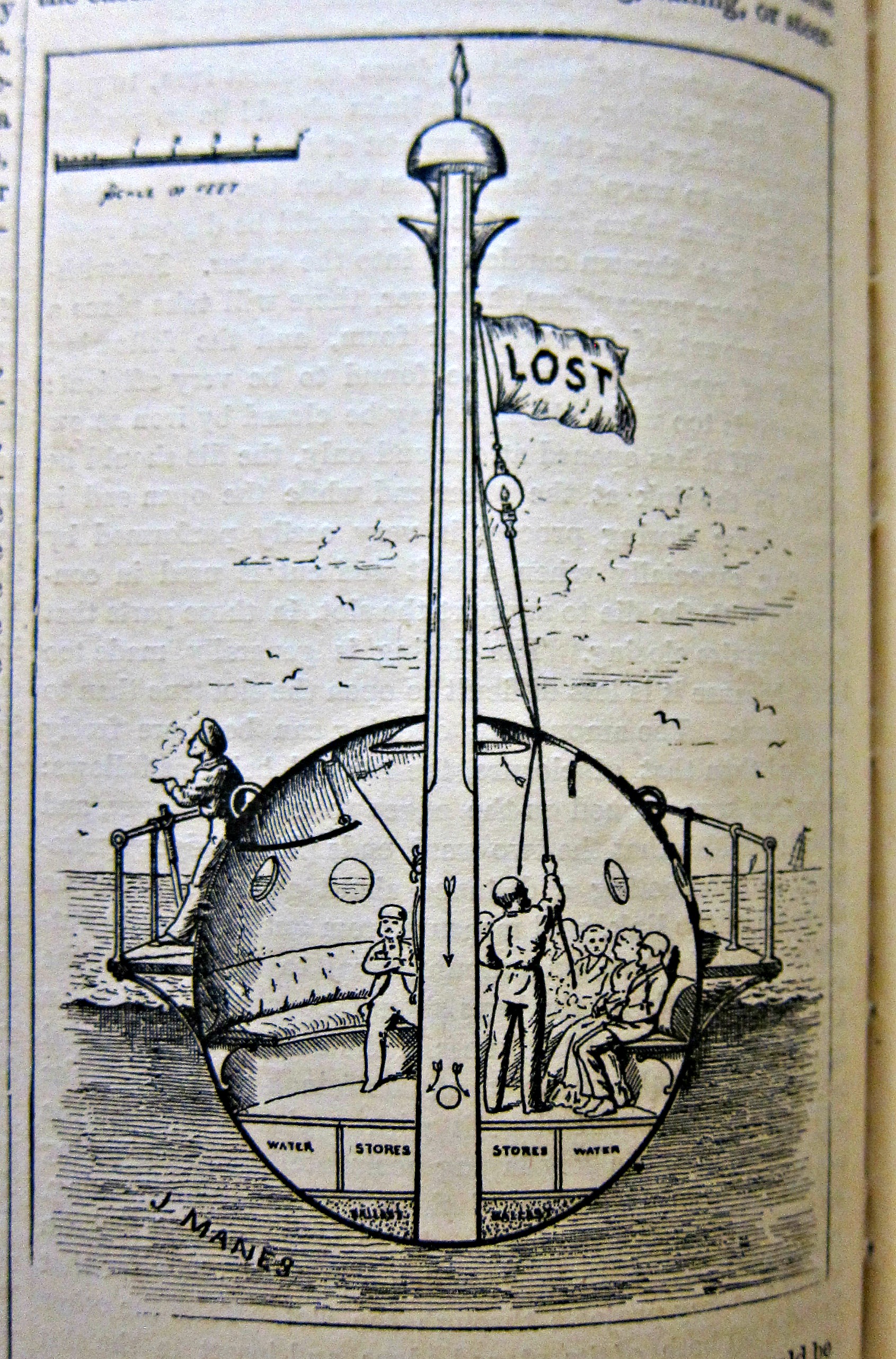 This floating sphere was ballasted so that it would remain upright even in a heavy sea, and looks as though it could carry 10 or 15 people. It came complete with mast and flag, and a wrap-around walkway, and as you can see it is being used in the image by a man having a smoke.