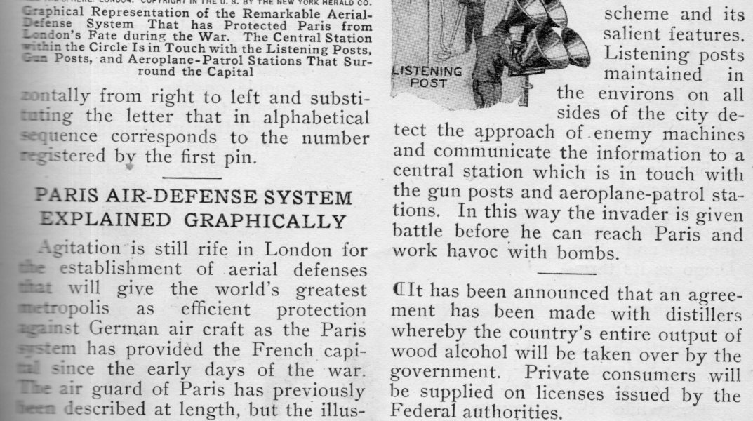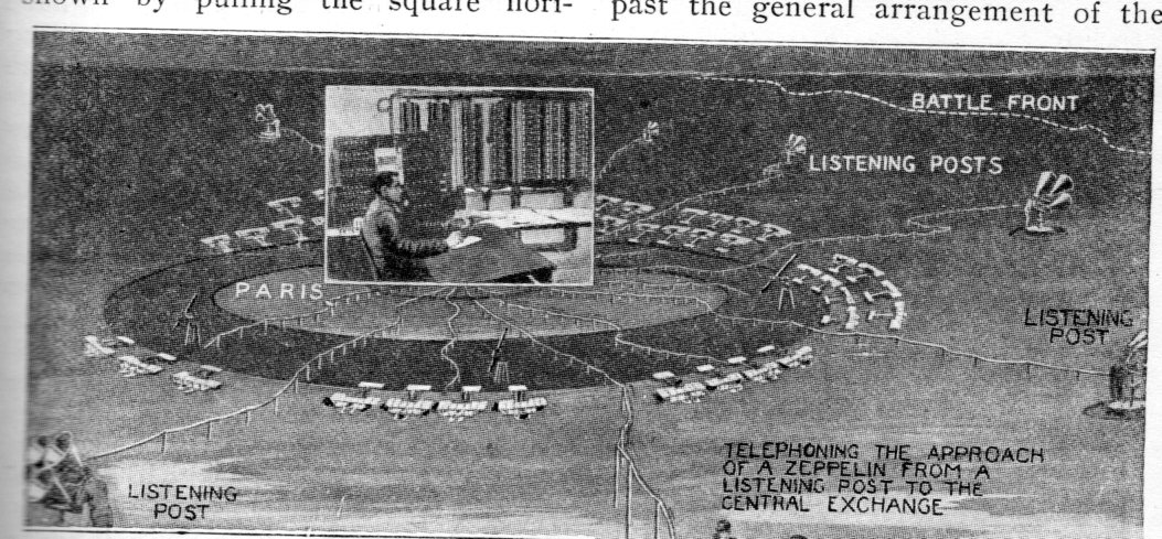 The use of aircraft in bombing was relatively new in WWI, and not terribly effective. And then, so was the defense against raiding aircraft--anti-aircraft, massed riflemen, searchlights, listening devices, all very new to the conduct of warfare, as were the airplanes and airships that ground forces were protecting themselves against. I was thinking about this just now after having seen the (following) short notice in the April 1918 issue of Popular Mechanics (with the text following the images, below). The diagram shows a version of an early warning system against incoming aerial assault, which was quite a good idea, complete with a central directorate to coordinate a response to the attack.