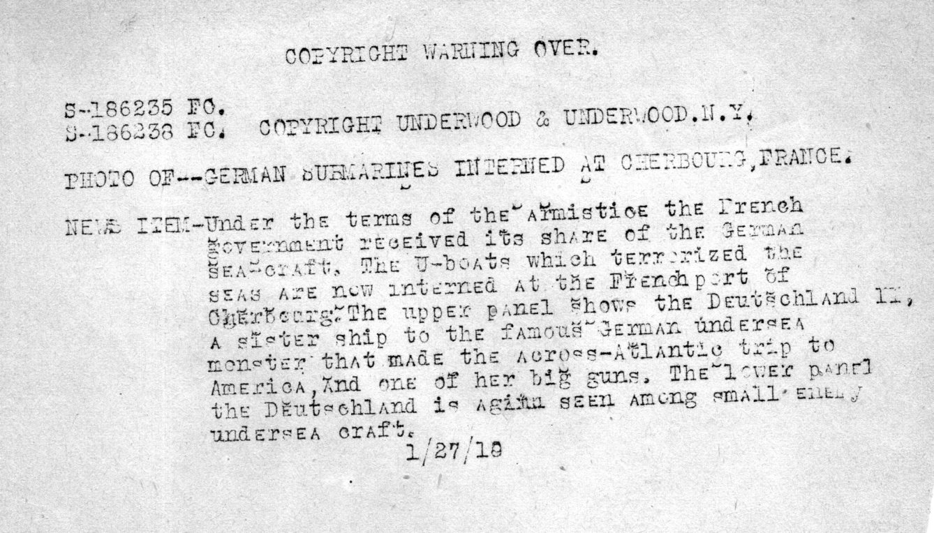 Similar scenes took place in France--here is another News Photo Service photograph showing surrendered German subs being taken in France, together with the paper slip that newspapers and other publishers were supposed to use with the image upon publication.