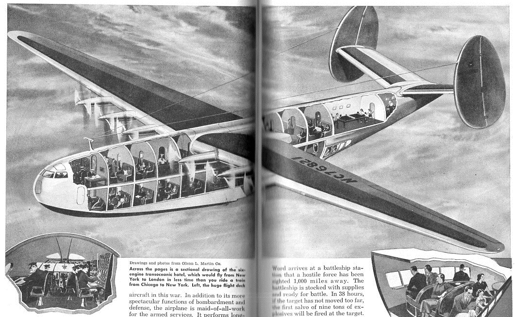 This was a bit of a speculative peep into the future by someone who actually may have been able to see into it--Glenn Martin was on the scene immediately following the Wright Brothers, and would go on to create an aviation company that would become Martin Marietta, and then Lockheed Martin. The article appeared in the September 1942 issue of Popular Mechanics. The plane was a beast, though a pretty one--it was also very restrictive, carrying 100 passengers in spite of its size. Packing people on wasn't the priority at this point (especially at a conceived round-trip ticket of $400 to Europe, real money in those days)--luxury was. When you look at the Bureau of Labor Statistics inflation calculator for that $400, it turns into about $6,000, which is something you might pay for your first-class accommodation to Europe, except with this plane you get a shower or bath, a lounge car, a ping pong table, and a LOT of leg room.