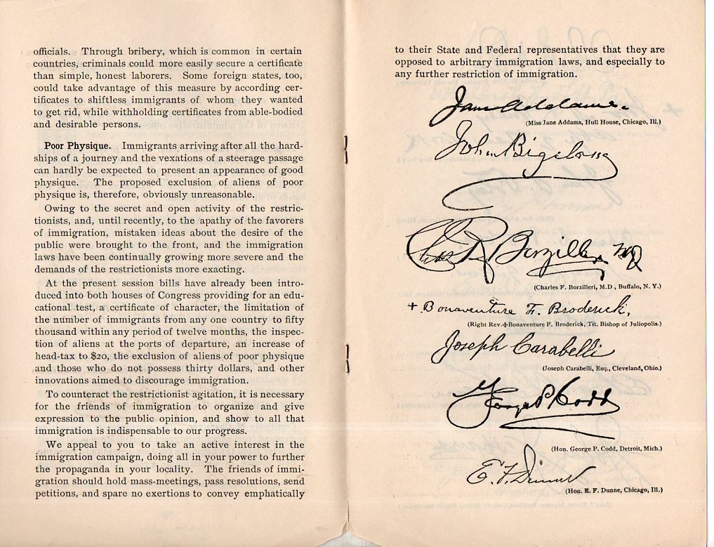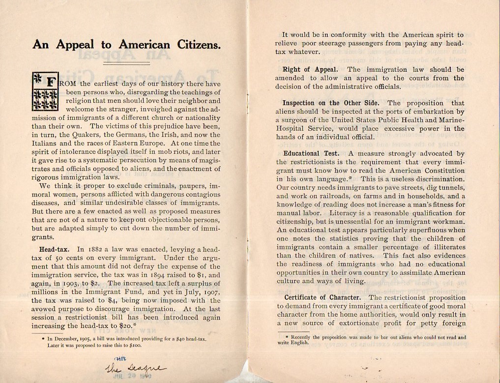 And so the reason for this recollection: the appearance of the pamphlet, An Appeal to American Citizens, published by the National Liberal Immigration League in New York City in 1910). This group was in favor of equality and acceptance of immigrants at a time when there were many very active nativist, restrictive, racist, and anti-immigration groups (and legislation), and laid out their conviction and approach very simply in this six-page pamphlet. It discusses the "victim of...prejudice" at the hands of "persons who, disregarding the teachings of religion that men should love their neighbor and welcome the stranger". They made good arguments, and given the brevity of the publication I reprint it in full: