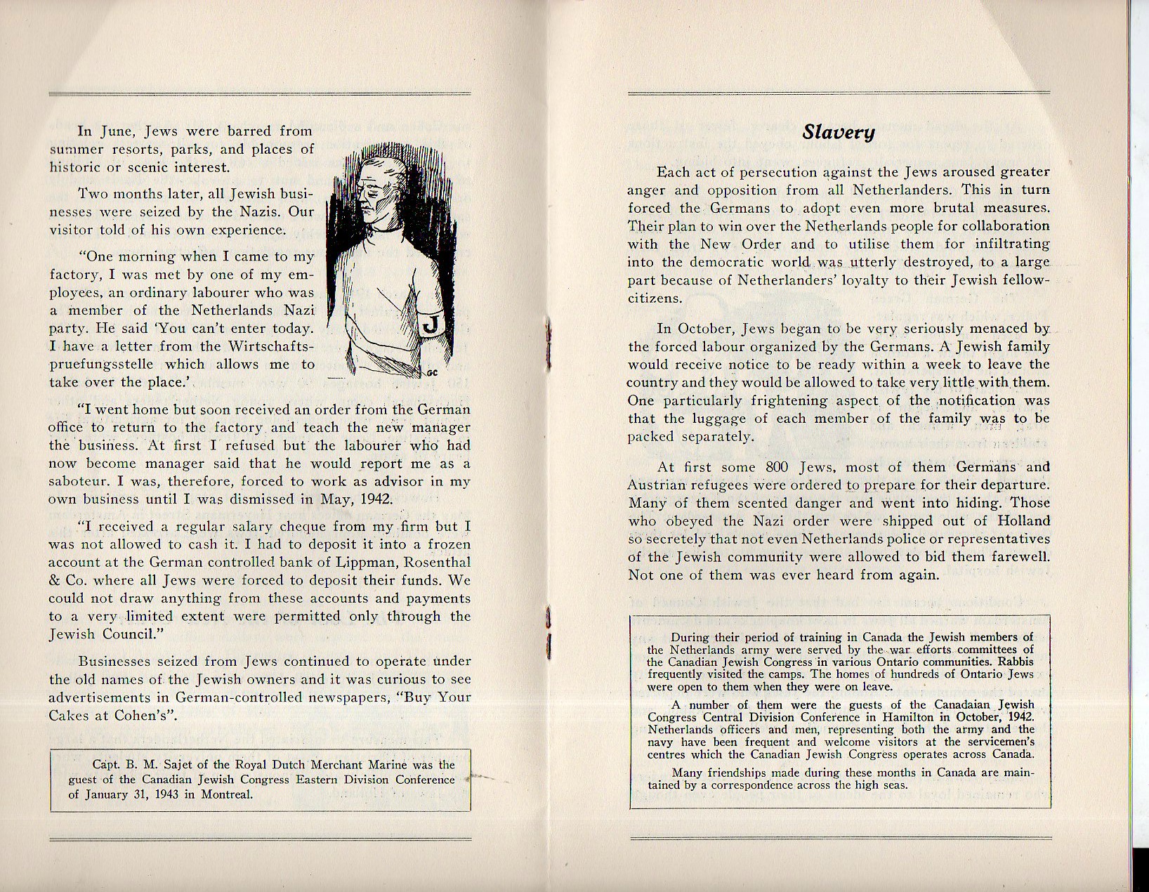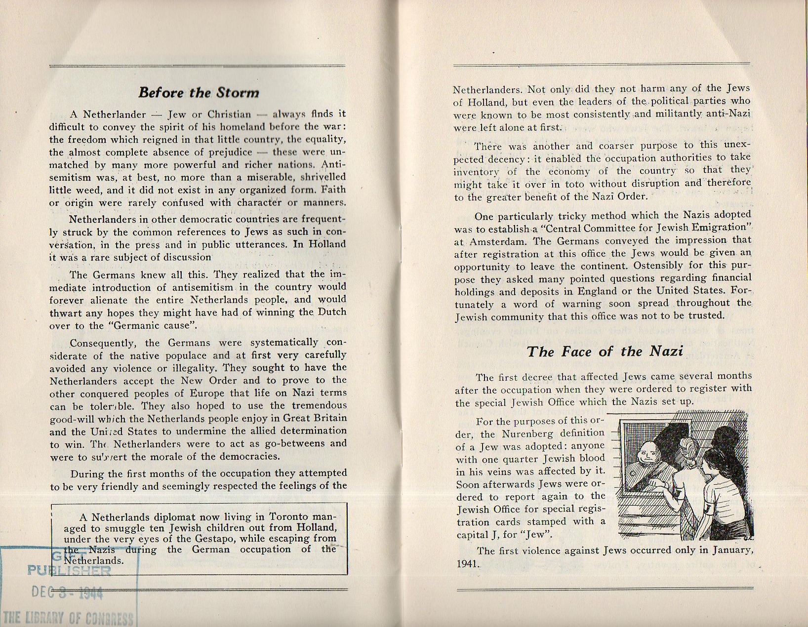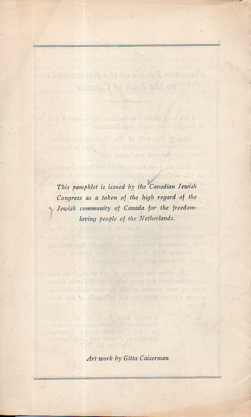 Witness from the Netherlands is a frank and concise eyewitness account from a Dutch Jew escaped to Canada, his account being published by the Canadian Jewish Congress in Montreal in 1944. He tells of a calm period at the beginning of the occupation by the Nazis and their efforts to ingratiate themselves with the Dutch--one of those methods was to ostensibly form an emigration policy for the Jews and having them register with the "Central Committee for Jewish Emigration". The facade did not last long, and the rest of the pamphlet is devoted to the violence after January 1941. The rest of the story is left to the reader--the pamphlet is only about 4000 words, and it is a recommended read.