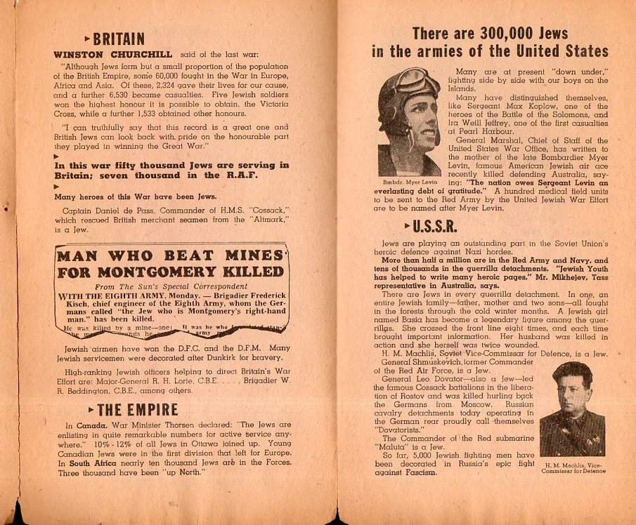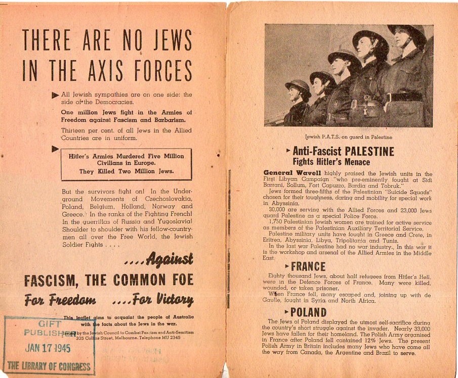 - 1,000,000 Jews in the Armies of Freedom. Printed in Melbourne, McLaren, Jewish Council to Combat Fascism and Anti-Semitism ca. 1944, my copy received by the Library of Congress in January 1945) 8x4”, 6pp, (tri-folded sheet of paper).