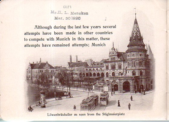 I found this nice association copy of an unusual pamphlet1--the work is on the Lowenbrau brewery in Munchen (with a nice bird's-eye view of the massive works), and it was given once upon a time to the Library of Congress by none other than the Bard of Baltimore, H.L. Mencken (1880-1956), who was known to enjoy his suds. As a matter of fact, here's a sort of quietly iconic picture of the man from the Baltimore Sun, legally enjoying his drink in Baltimore in 1933, right after the repeal of prohibition (1920-1933).