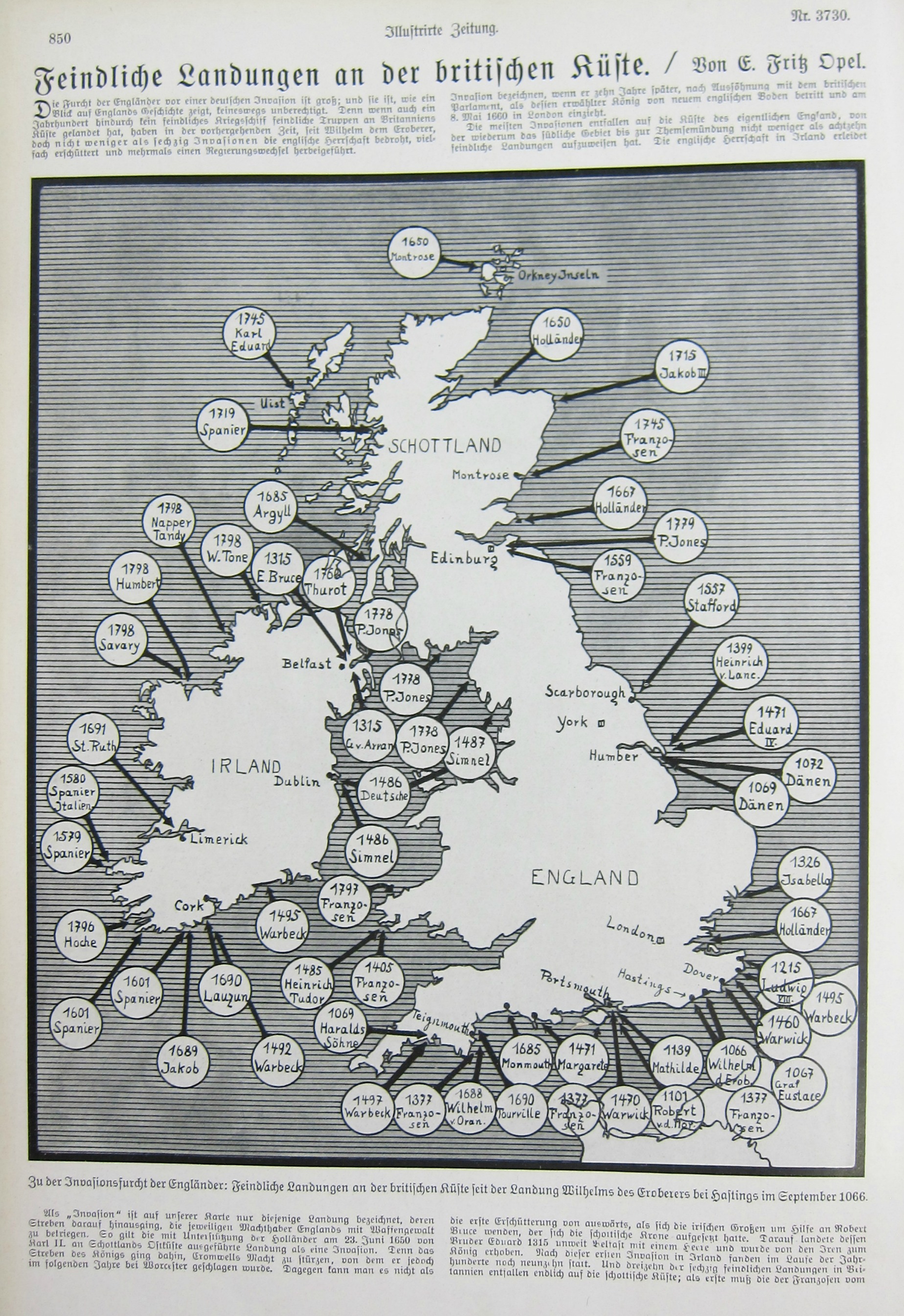 This piece of cartographic propaganda appeared in the fifth month of the war in the Illustrirte Zeitung (Leipzig) on Christmas Eve, 1914--it was in its way a vision of hope for the popular audience that this German equivalent of Life magazine reached. Perhaps it was a comfort to read that Great Britain and Ireland had been invaded before--many times--and that it might happen yet again; perhaps it was a comfort at a time when the realization dawning on tens of millions of people that This War would be over by Christmas, but it had really just only begun. Not much comfort though can be had in a piece of paper.