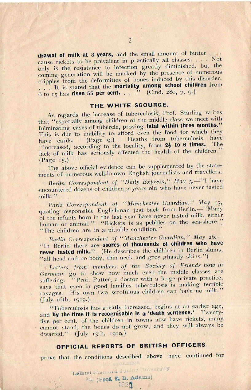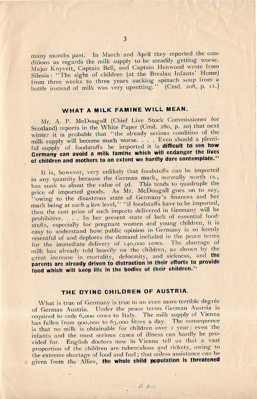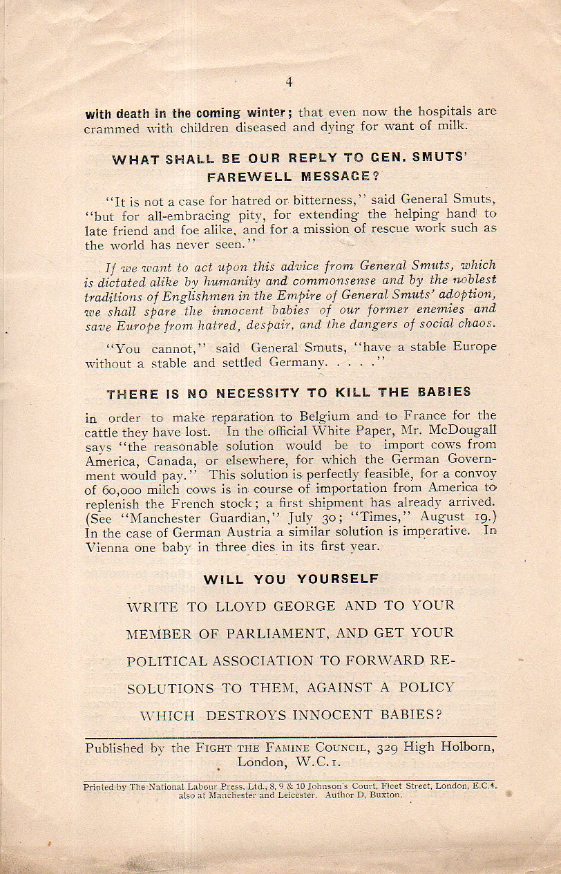 This is one of the pamphlets published by the Fight the Famine Council, published in London in 1919/1920/ Fight the Famine was founded in January 1919 to fight for the lifting of the embargo still in place for Germany and its Allies by alerting government figures and agencies about the conditions brought on by the continuing years-long embargo. Leading the Shall Babies Starve pamphlet is (as you can see below) a strong quote by Winston Churchill (who at the time was Secretary of State for War, 1919-1921), who insisted that using food as a weapon was "repugnant to the British nature". Of course this one of the results of the embargo, which no doubt lead to the deaths of hundreds of thousands of bystanders, including women and children. Shall Babies Starves outlines the effects of the continued embargo on on infants and children, including short sections on "what a milk famine will mean", tuberculosis, and "there is no necessity to kill the babies". This was a four-page leaflet, reprinted in full: