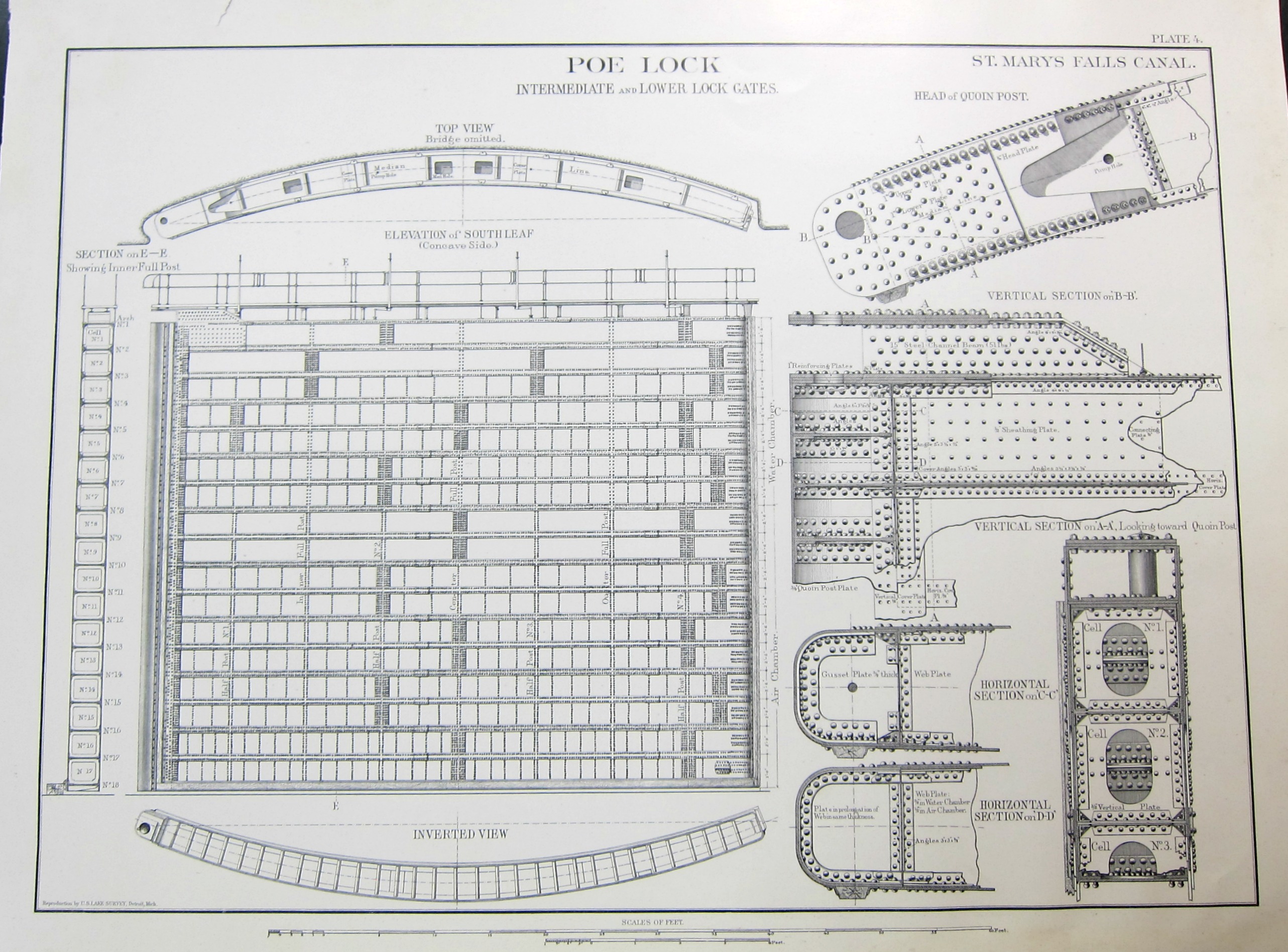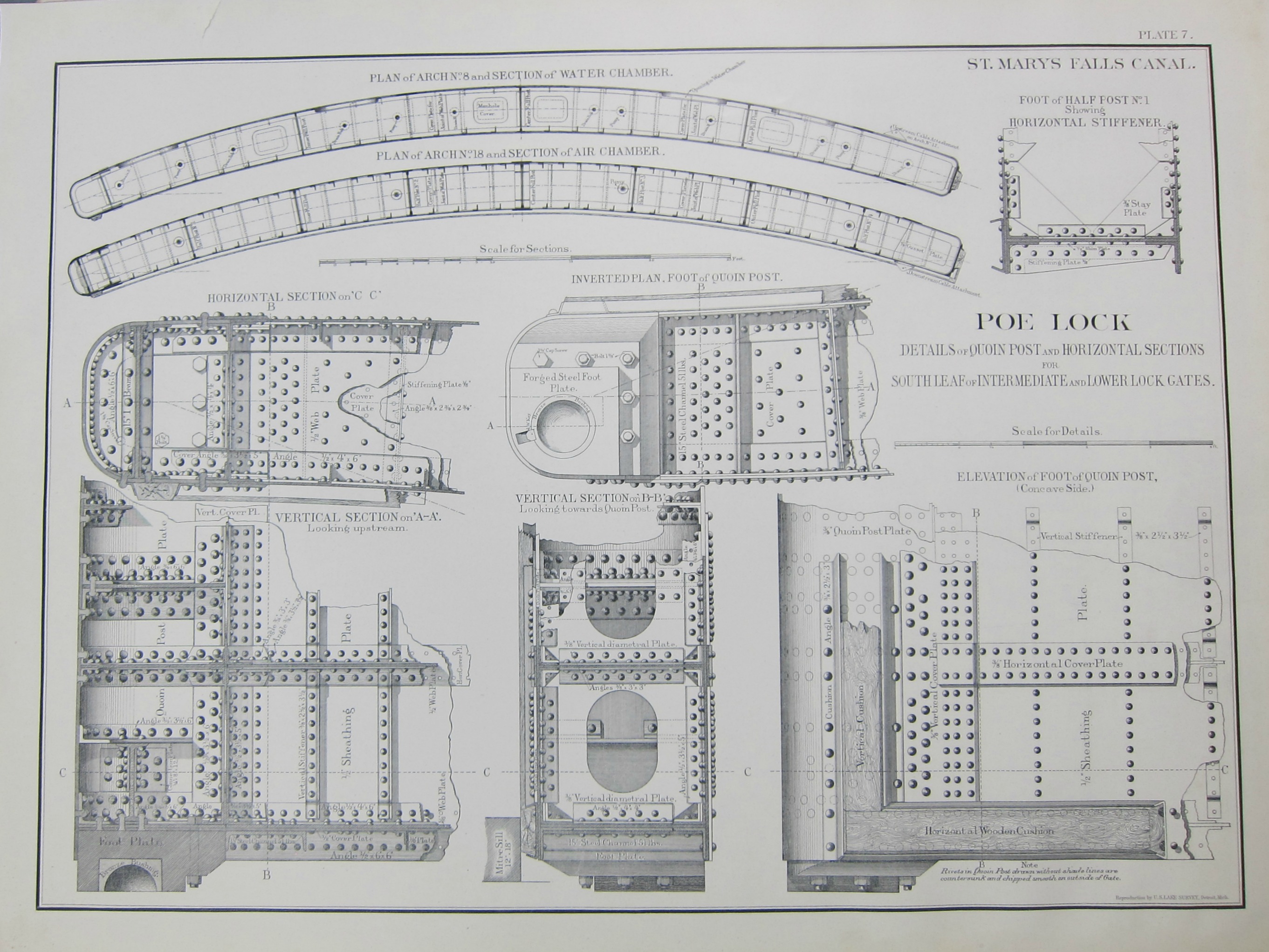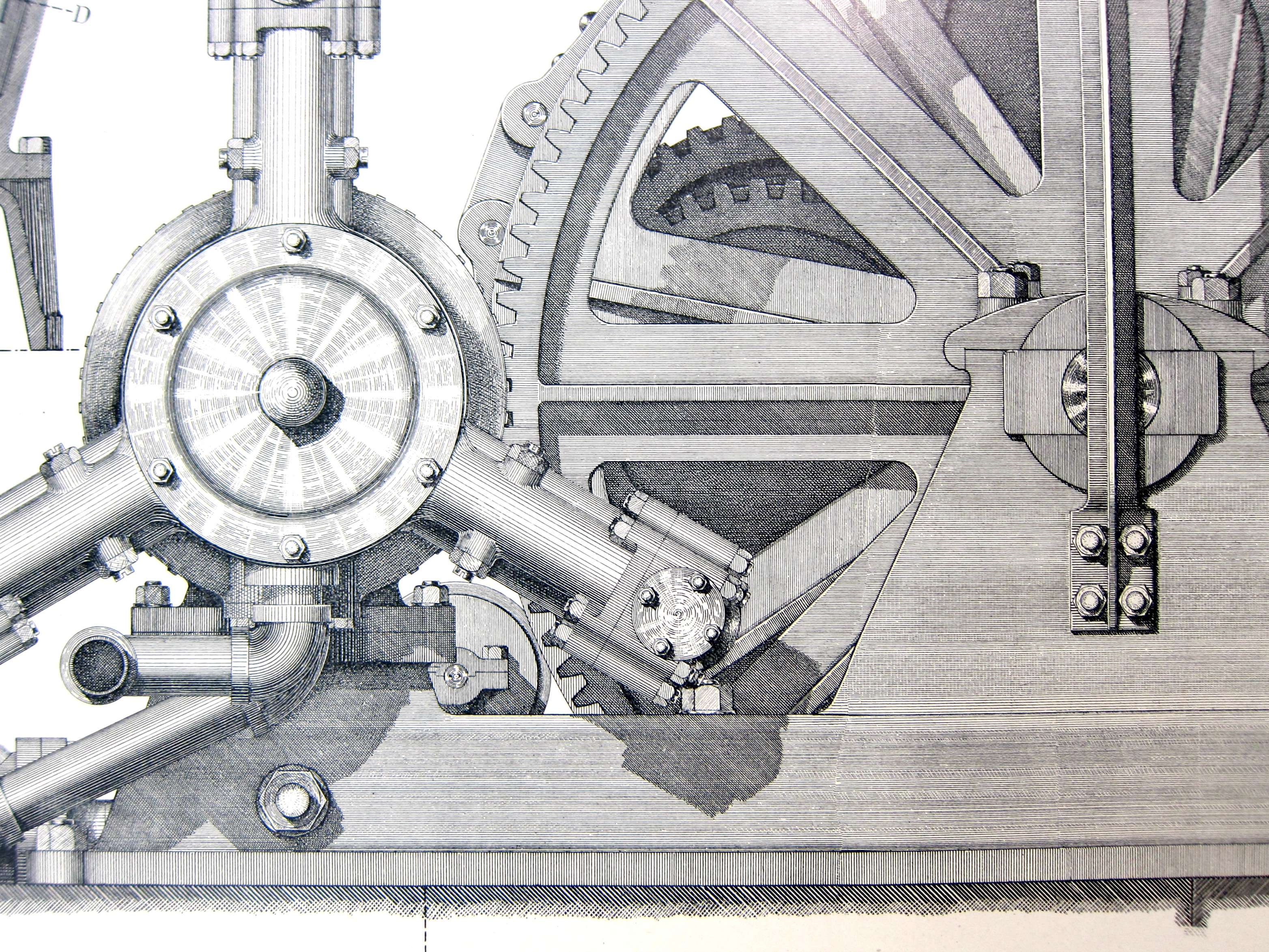 The Soo Locks at Sault (the "soo" of "Soo") Ste. Marie are the four parallel locks that connect Lake Superior with Lake Huron and thus the rest of the Great Lakes--the Poe Locks, designed by O.M. Poe, are on of the four, and when it was completed in 1896 it was the world's largest. At 800'x100' they were enormous, and controlled the displacement of a lot of water, and the illustrations below show some examples of the meat of the engineering that controlled that process. I have these loose engravings from an unfortunately unidentified source (though they are from a U.S. Lake Survey,between 1898-1909) and decided to share them because of their deep engineering beauty. They are fantastically-rendered objects, filled with steam and grease and huge amounts of The Heavy Stuff, all of which display a remarkable feat of engineering.
