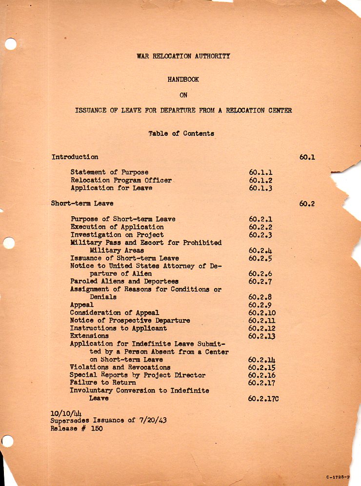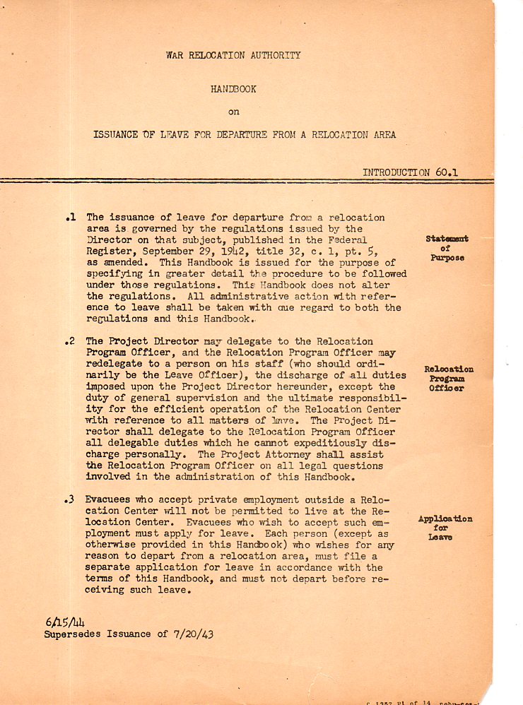 From my reading this series of rules and regulations for the possibility of an "evacuee" to leave the relocation center is a Menkenian example of using 10 words where one word will do. The introduction is sufficient enough for a general reader to be able to guess at what is to come over the next 100+ pages: