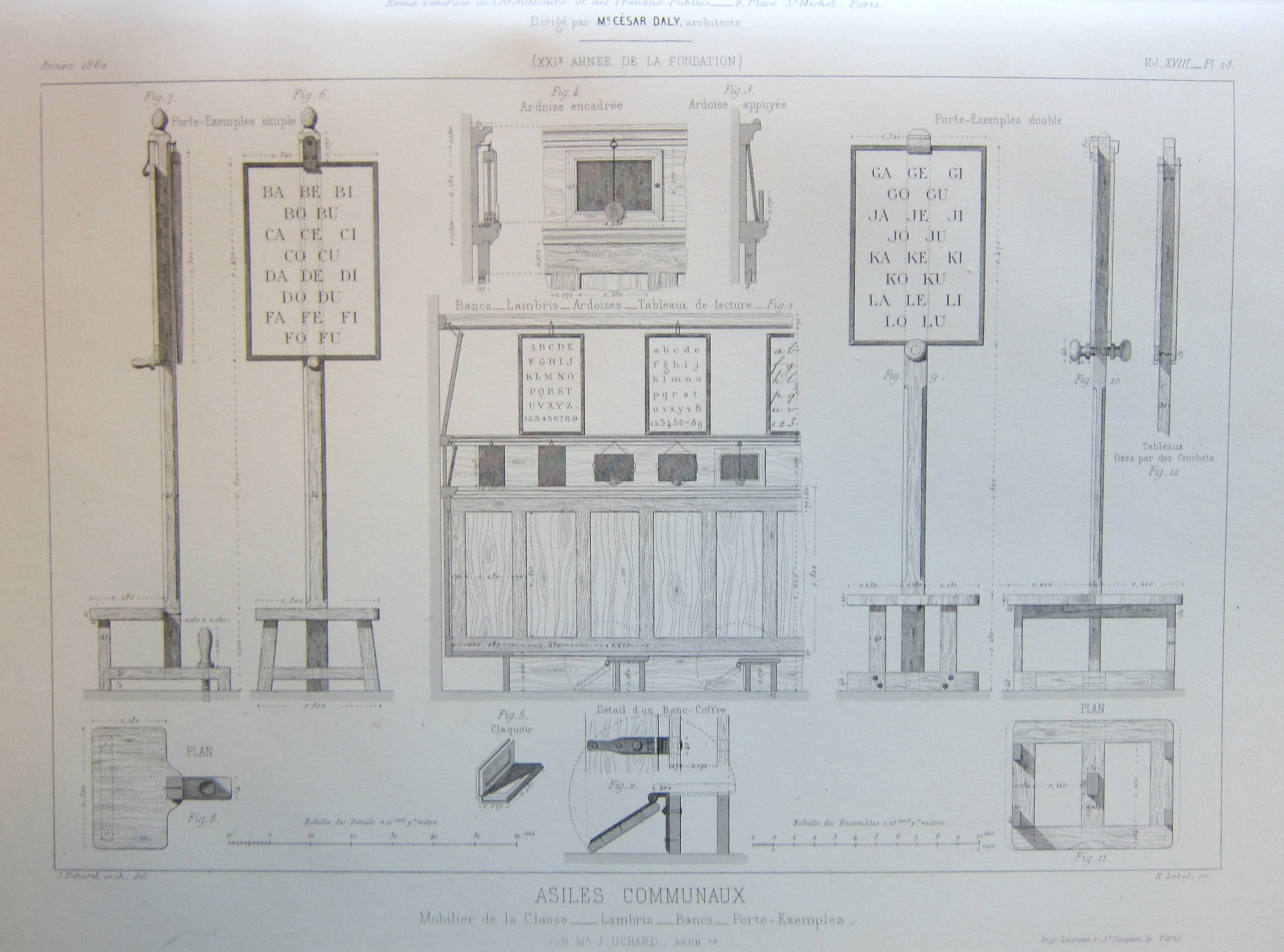 The engravings are the work of the prodigiously talented and very busy Caesar Daly, who in addition to writing and editing books also edited the journal Revue Generale de l'Architecture et des Travaux Publics, des architects des ingenieurs des archeologues des Industriels et de Proprietaure, these images coming from volume XVIII, printed in 1860, in the section “etablissements d'instruction primaire”.