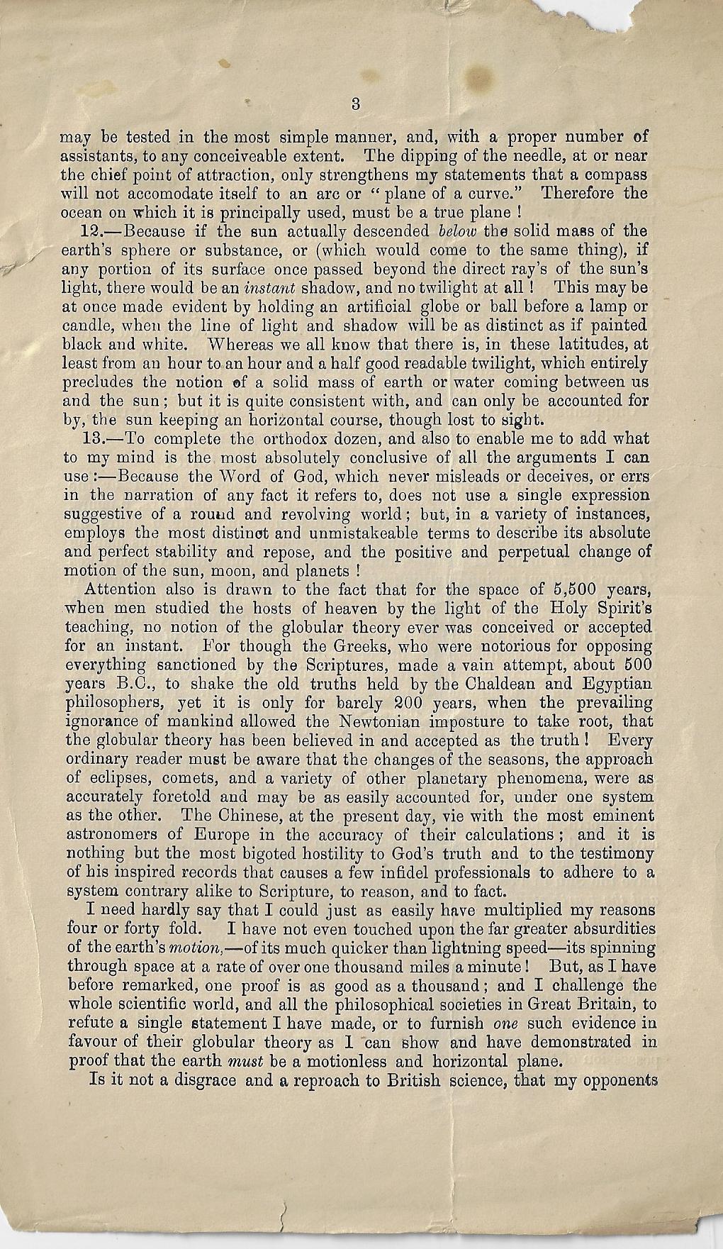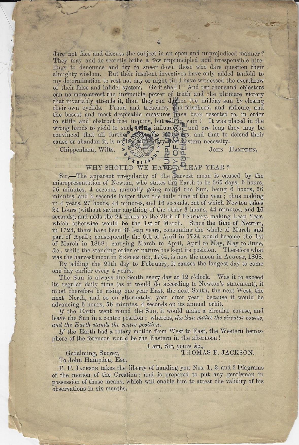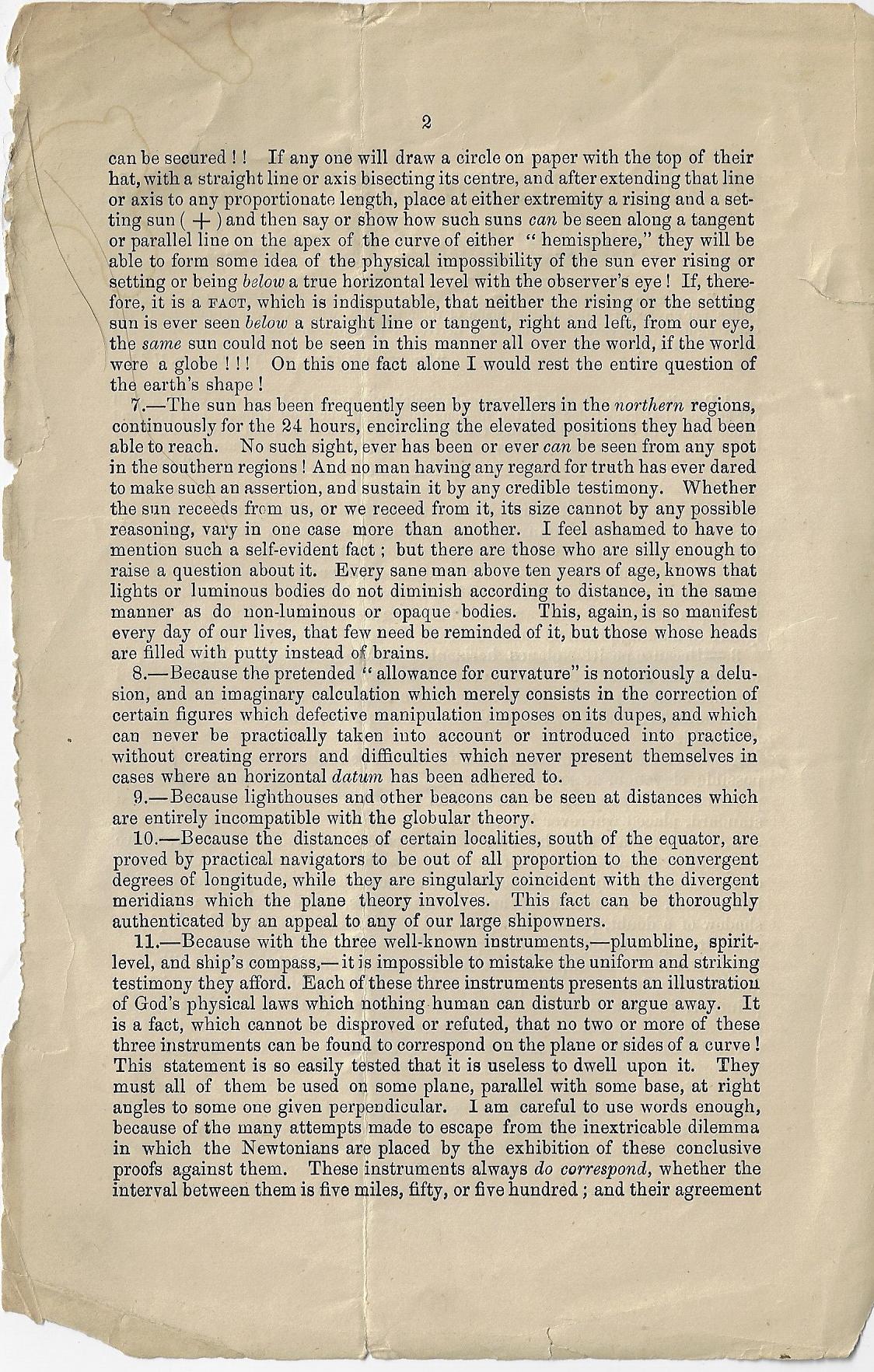John Hampden (d. 1891) was a fire-breathing Bible-literalist flat earther who rejected Newton & Co. at every opportunity and at all costs, doing as he was the work that the creator of the universe that he felt demanded of him. He famously feuded with the great Alfred Russell Wallace over a lost bet disproving the flat earth and pursued him via lawsuits and published vindictive. I don't want to spend too much time with this, but I will reproduce below his leaflet missive advancing his theory, mainly because it looks as though it is pretty rare. It seems as though this was a separately-printed affair of his article that appeared in the rather bumpily named Weston-Super-Mare Gazette on November 11, 1871.