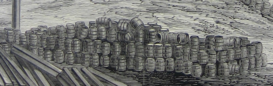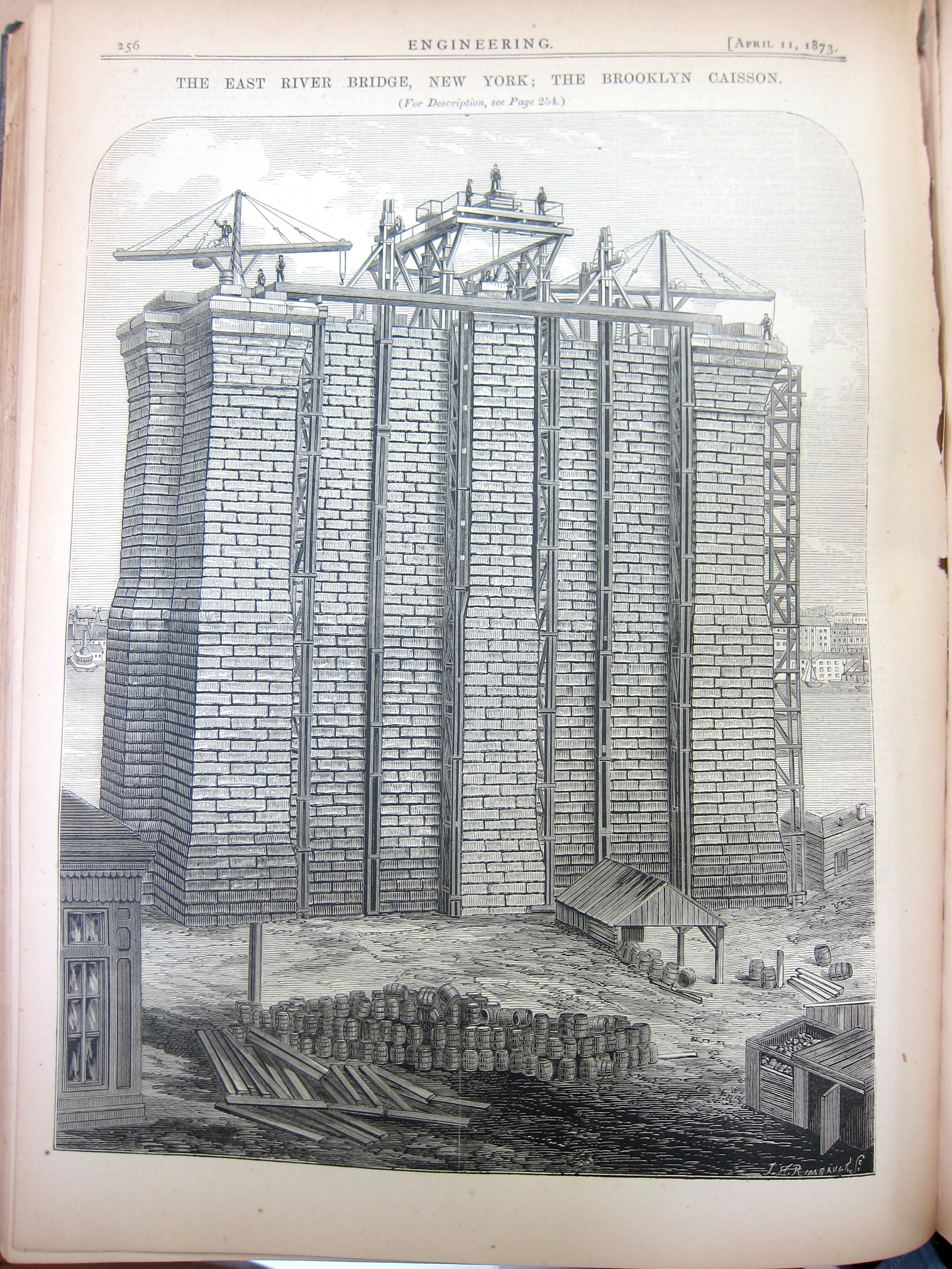 This dramatic image of the foundations of the New York and Brooklyn Bridge (and then the East River Bridge, and then in 1915 the Brooklyn Bridge) appears in the journal Engineering for April 11, 1873. It is a massive structure, and like a tree there is as much going on for it underground as there is above; and in all of that, one of the most interesting elements is the pile of barrels in the foreground, a detail of which is below: