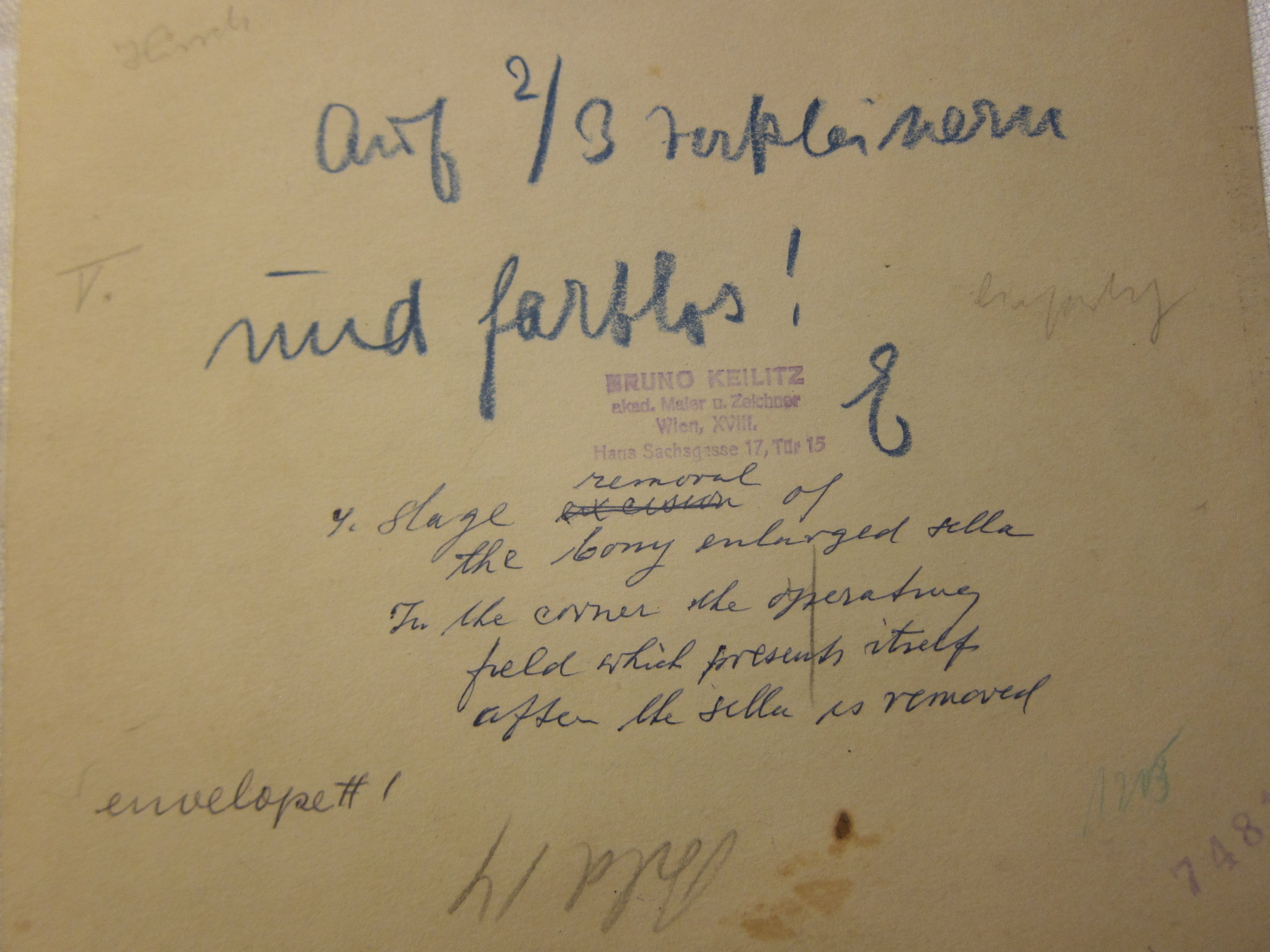 - Of the 12 drawings, 9 are very closely related and show the progress and route of a transsphenoidal surgery for the removal of a pituitary tumor. I feel pretty confident that these drawings were done in 1930 (see below). These images are labeled I-VIII (including a “Ia”). These images measure about 6x8.5 inches each, drawn on a heavy stock, and done in colors. Each of these images is drawn from the same perspective and show different aspects of the surgery in progression. These drawings I-VIII are all rubbers tamped on the back with Bruno Kelitz's name and address; two of this series are signed by Kelitz in the drawing, both of which are dated 1930. There are also some other notations in ink on the reverse that I can't quite place, as well as some later dates, as the images seem to have been used on more than one occasion.