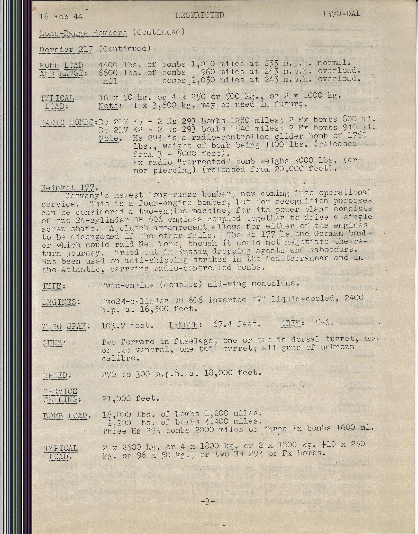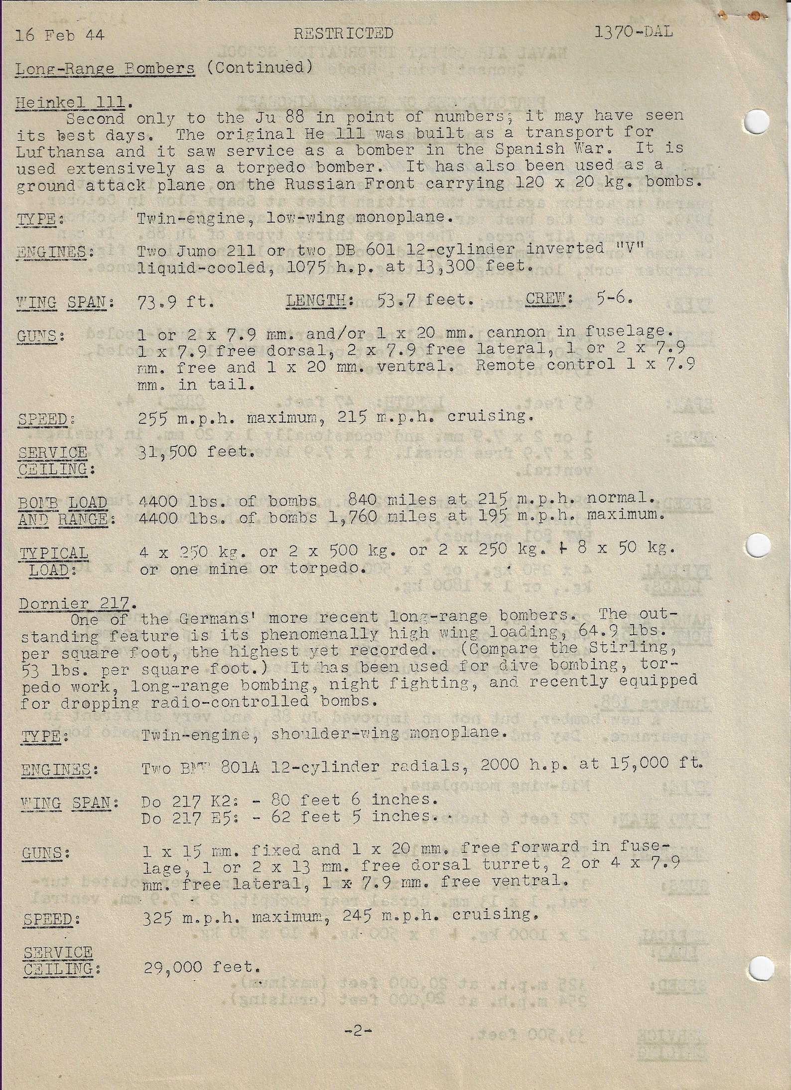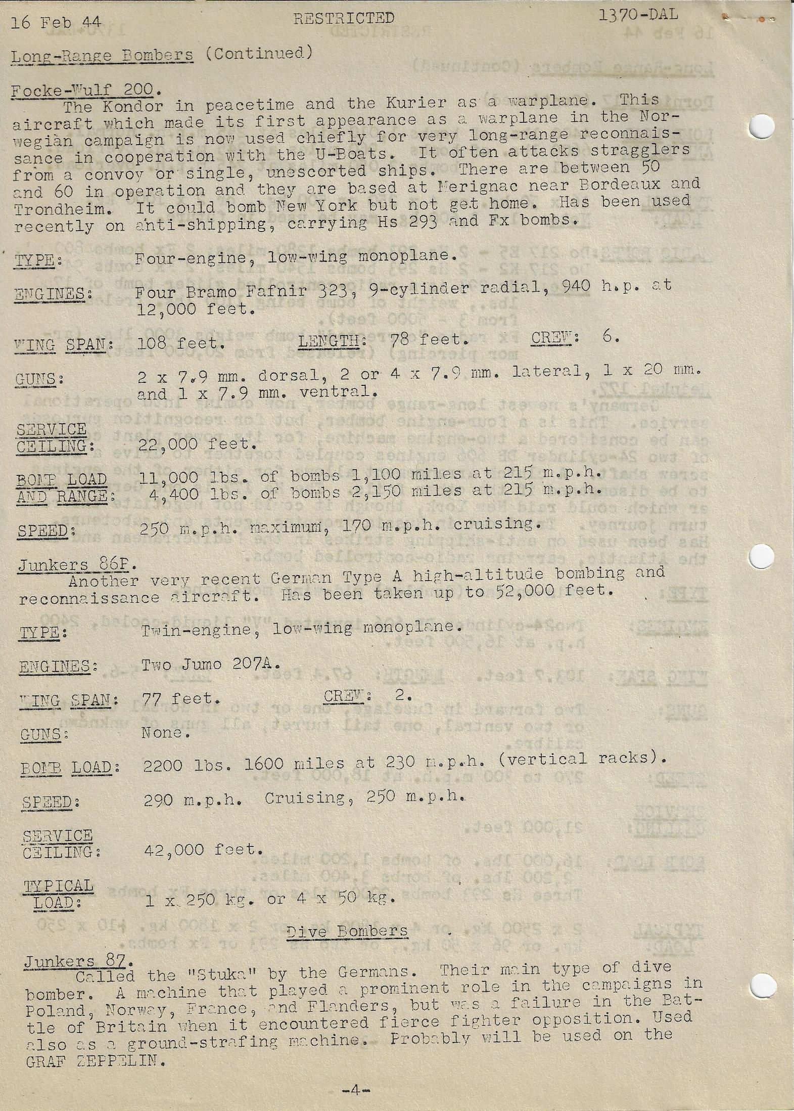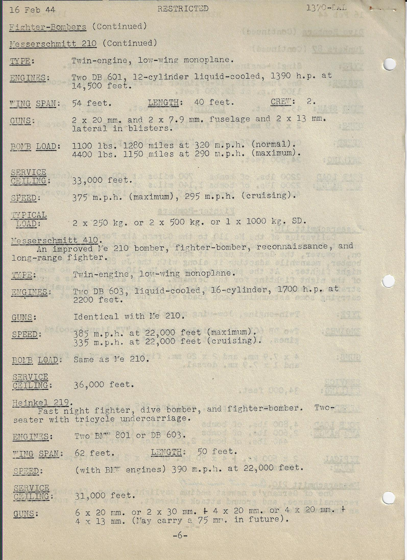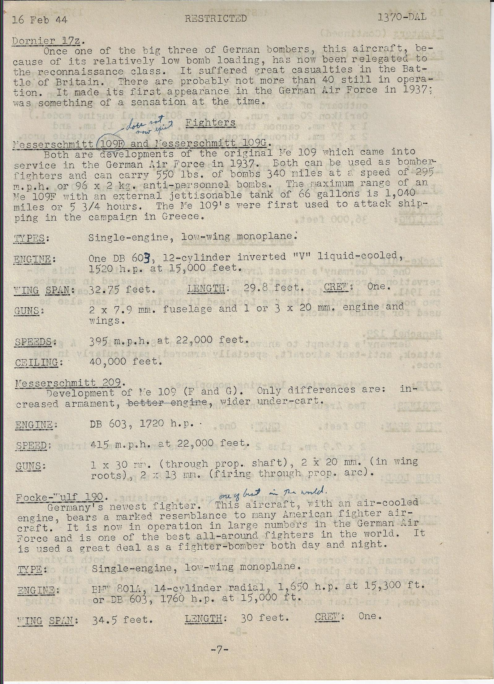 "Performances of German Aircraft" (16 February 1944) is one of several dozen pieces that were loose-leaf bound by a naval student of the Naval Air Combat Information School at Quonset Point, Rhode Island. The entire notebook is interesting as a whole from a pedagogical point of view, and teh components are usually very engaging (and even noteworthy) on their own. The nine pages that comprise this Luftwaffe section of the classwork (identified as "RESTRICTED" in the offset typed original) are an outline for the classwork and no doubt augmented during lectures--but as they stand it is s statement of the base knowledge for what was being taught to intelligence officers.
