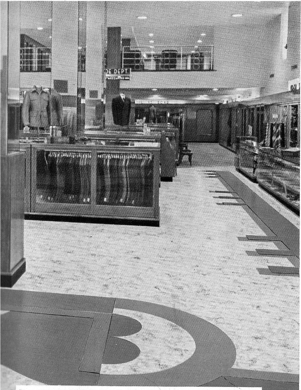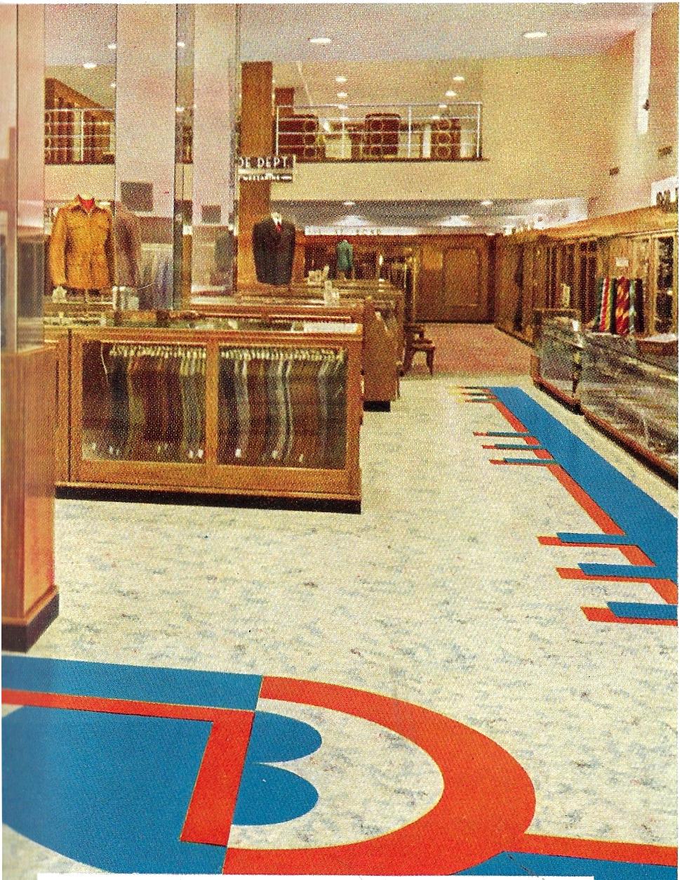 Here's another in this series of fabulous color in 1930's and mid-1940's designs, and the third from the Armstrong Cork Company and their sales pamphlets for their linoleum flooring (Better Floors for Better Business, printed in Lancaster, Pa.). As I've said earlier, it is somewhat jarring to see these designs in color when we're so trained from the pre-color movies to see them in all of their tremendous facets of black & white mixes. It is hard to think of Sidney Greenstreet gliding across a room or through a restaurant that is bathed in nothing but shades of gray, when in fact he could've been wearing a brilliant plum-colored suit and moving across a flaming red floor. And in this case, with Armstrong, they did indeed make flaming red flooring--and in stark contrasts with yellows and blue designs.
