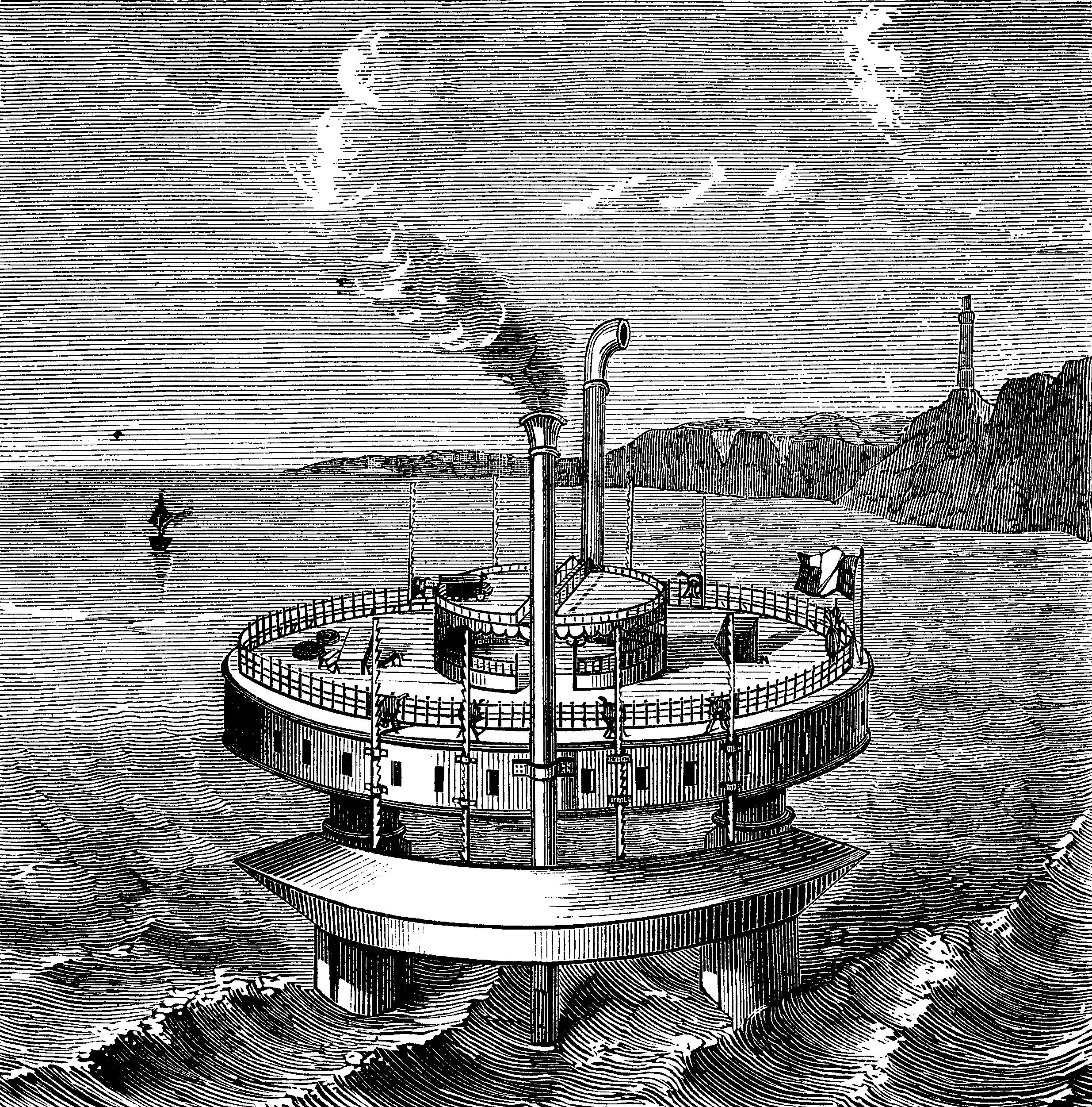 Next is this fantastic set of drawings for a proposed circular semi-submerged ship, the work of Donato Topmmasi of Paris, and which appeared February 24, 1877, in the Scientific American, page 115.