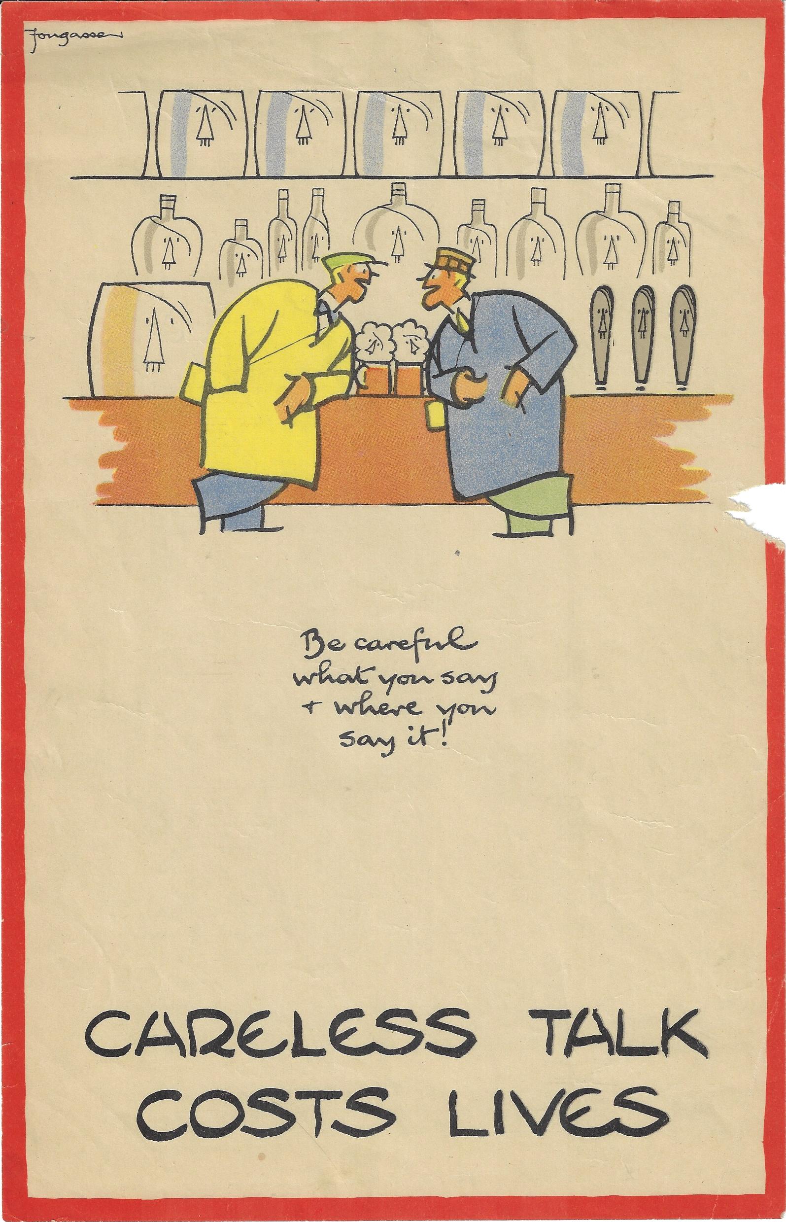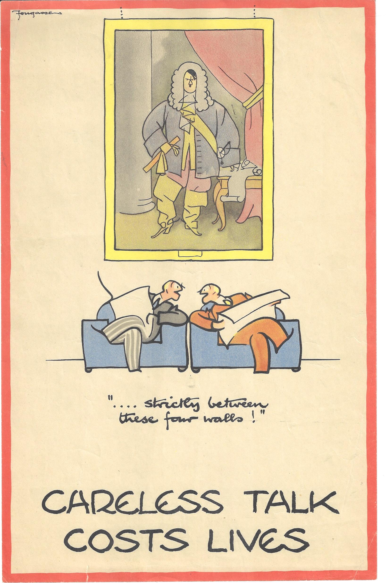 The series in general depicts people sharing a piece of possibly sensitive information that in the wrong hands and together with other pieces of info could reveal devastating secrets—and in each case there are figures lurking/loitering/disguised in the background waiting to collect the data, and generally a poorly disguised Hitler or Goering or both. Fougasse was able to make his message immediately memorable and understood because I think of his understated over-the-top visual humor. The images were funny, but the message was deadly serious. Also, you really didn't even need to read the text to understand the message. (This is in the same vein as some of Thomas Nast's finest work, conveying social content and a political message to the illiterate, making his devastating (and usually highly textual) cartoons understandable without needing to read them.)