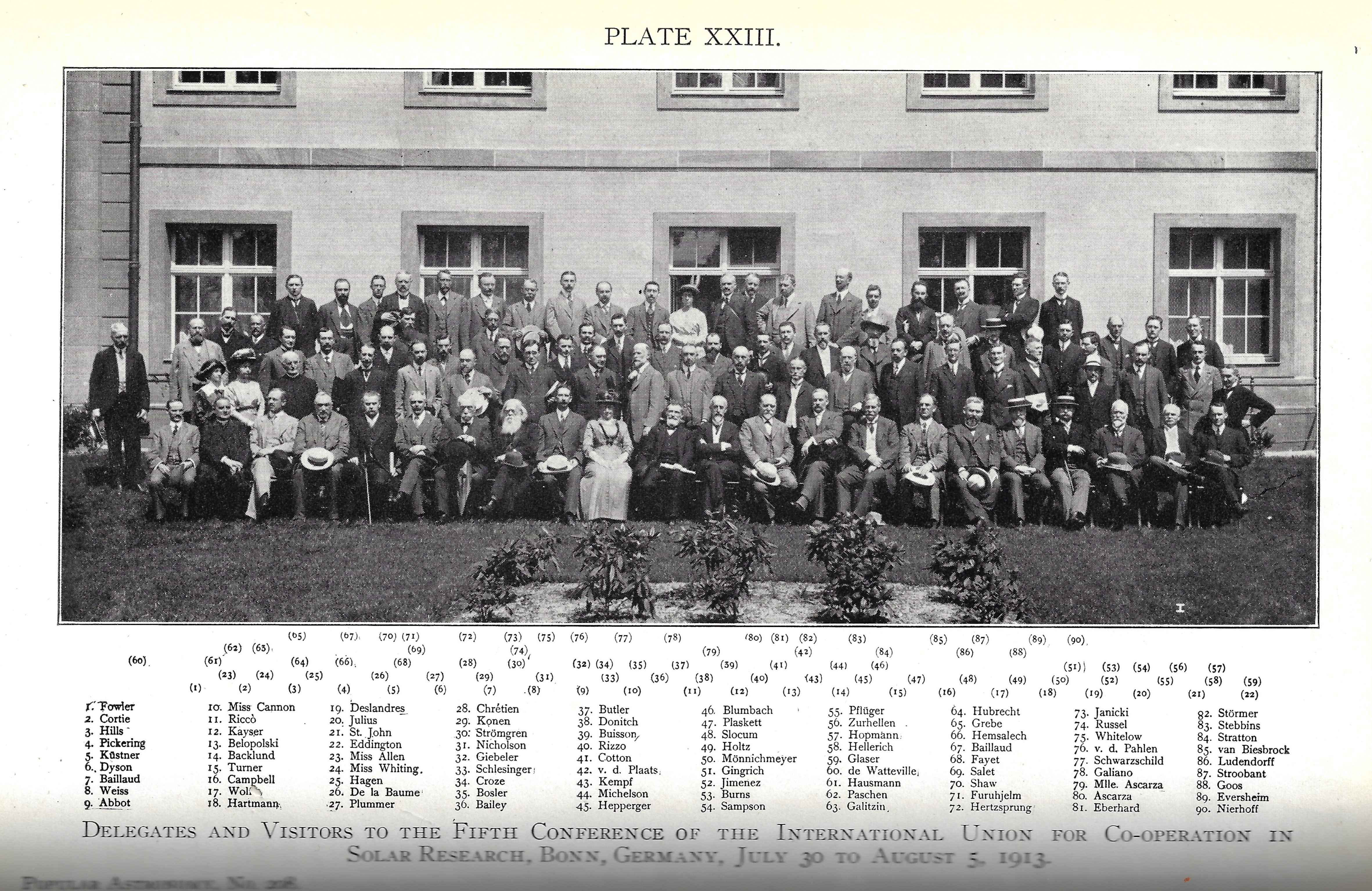 I found this fantastic photograph of the attendees of the meeting of the Astronomische Gesellschaft at Hamburg, August 1913 in the December issue 1913 issue of Popular Astronomy. This is an august group, and of course they're not "blank" or "missing"--its just a function of some out-of-context observations on the opaque overlay that serves to identify all of the folks in the massive group photo. (I've encountered these numerous times over the years and always have found the Found-Art aspect of them interesting and amusing.) The fact of the matter, though, is that there were some very high-powered people at this meeting. Offhand I identify Mader, Eddington, Abbott, Mueller, Plassman, Struve, Plaskett, Campbell, Repsold(s), Jansen, Schwarzchild, Backlund, Seeliger, and numerous others.