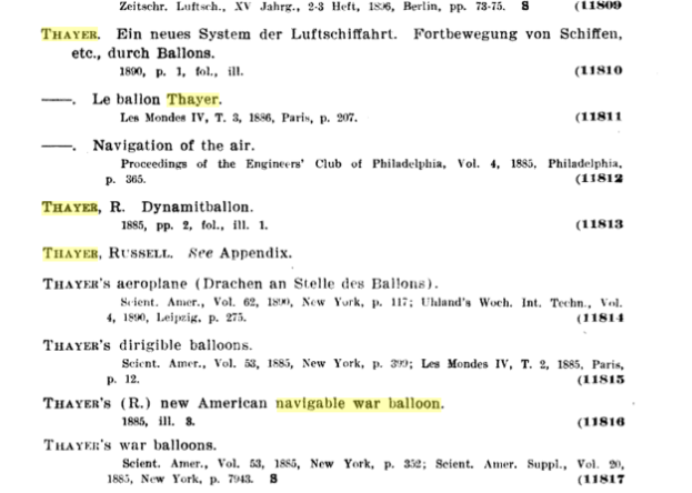 These are the entries for Thayer in the early and pioneering work by Paul Brockett, Bibliography of Aeronautics, (Smithsonian Institution, 1910, Miscellaneous Collections #35):