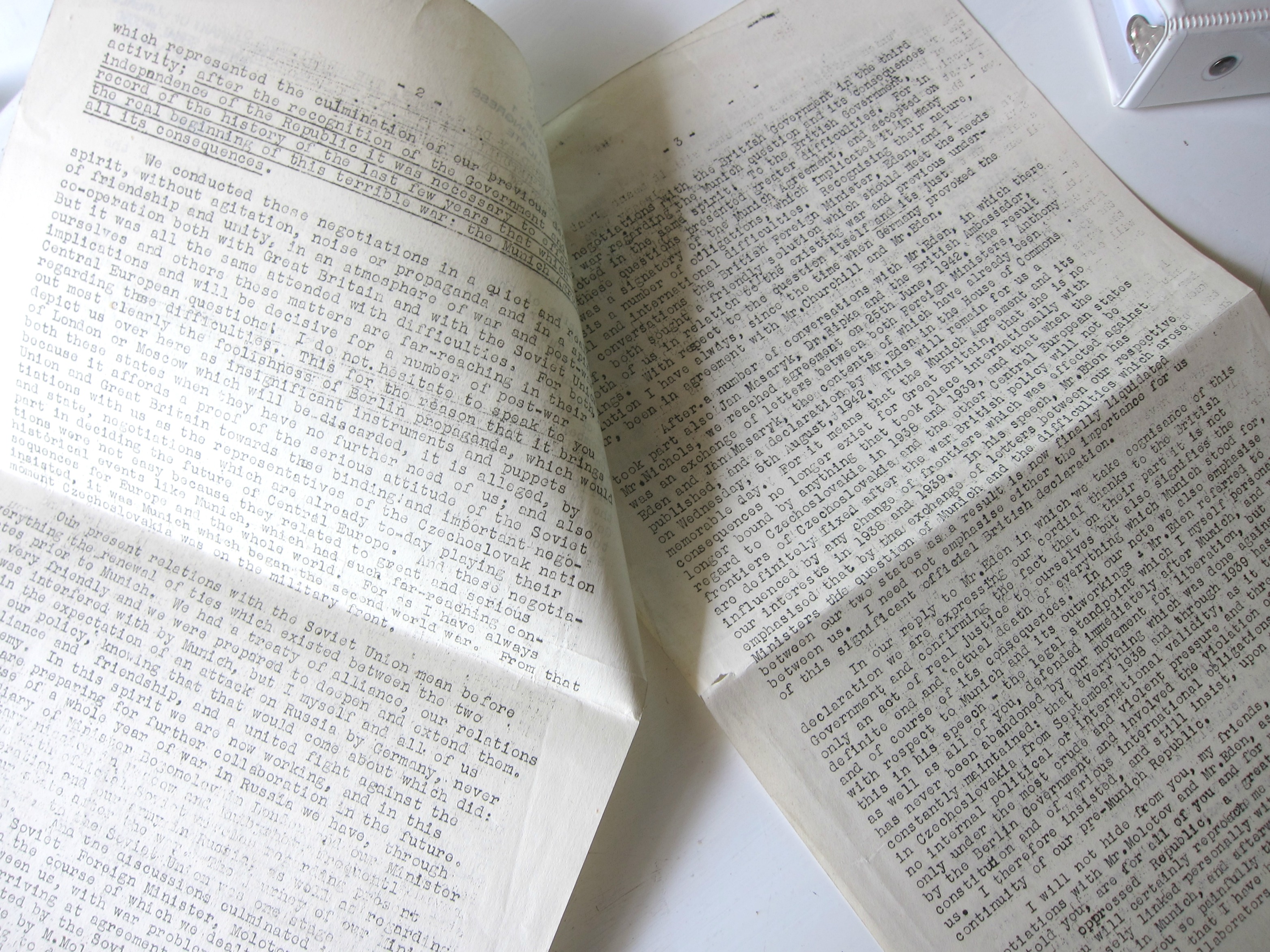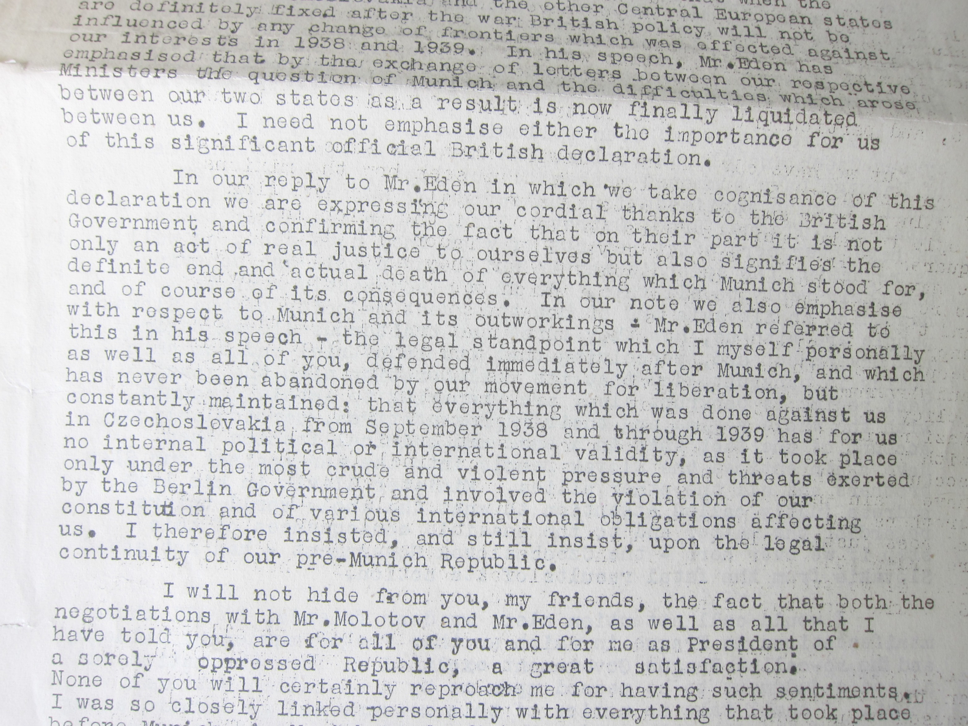 This morning I'm sharing a scarce document1of a radio broadcast for 8 August 1942 made by the president of the Czechoslovka Republic, Edvard Benes. In this address Benes (1884-1948) announces the formal nullification of the dreaded Munich Agreement (or Munich Diktat in Czechoslovakia) of 30 September 1938 in which the infamous "Peace in Our Time" appeasement was made with Hitler granting the Nazis annexation of certain parts of Czechoslovakia, and without the participation of the Czech government. Benes, who was the president of Czechoslovakia then in exile in London, reports on the action of Jan Masaryk concluding a treaty with the British government on the "final liquidation" of the Munich agreement and the return of the seized lands come war's end.