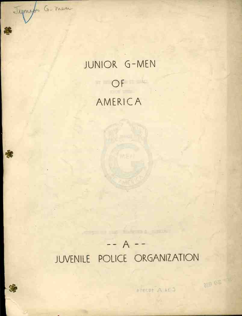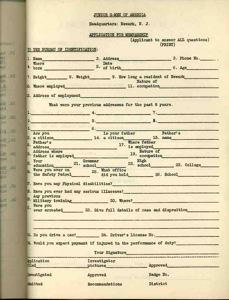 There's actually more to be filled out (and with more exacting questions) to join the "Junior G-Men of America" ("a Juvenile Police Organization") club. This 1936 document was meant for kids, or advanced kids, and asked some pretty creepy and too-detail questions of its potential members, including whether or not the applicant would expect to be paid if injured in the line of duty. (The Junior G-Men organization became very popular, with all manner of toys and badges and guns and so on, with radio series and movie spin-offs, though it seems not have made it much into the 1950s.)