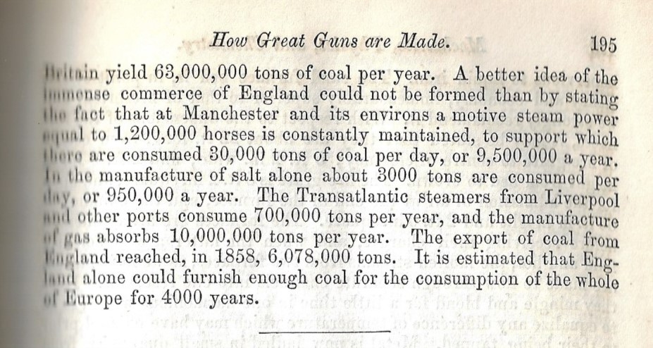 In the last 24 hours I've come across two antiquarian outlooks on the longevity of the world coal supply after not having seen hardly anything of the sort written in the 19th century. (The 20th century, even in its first decade or two, is another story.) The first was an article by the engineer John Ericsson, who wrote on the temperature of the heliosphere of the Sun in Nature for 1871 (and came quite close) which led to an earlier paper from 1868 in which he hypothesized a short lifespan of coal and advocated for forms of "solar energy". Then came this article from 1859 (in the month of publication of On the Origin of Species which hypothesized a much more abundant future for coal deposits, which the writer figured to be 36,000 years. Unfortunately his terms aren't very well defined--was he addressing the coal production of Prussia or Europe or the world when discussing "the quantity of coal dug in 1857"? When stating "the lands from which the coal is procured" may be 8,000 square miles, did that mean an 8,000 square mile swath of Germany, or 8,000 square miles of mined coal in Europe, or etc.? New Hampshire is about 8,000 square miles, and the entire Prussian Monarchy was about 110,000 square miles, so maybe that meant packets of mining surfaces here and there?