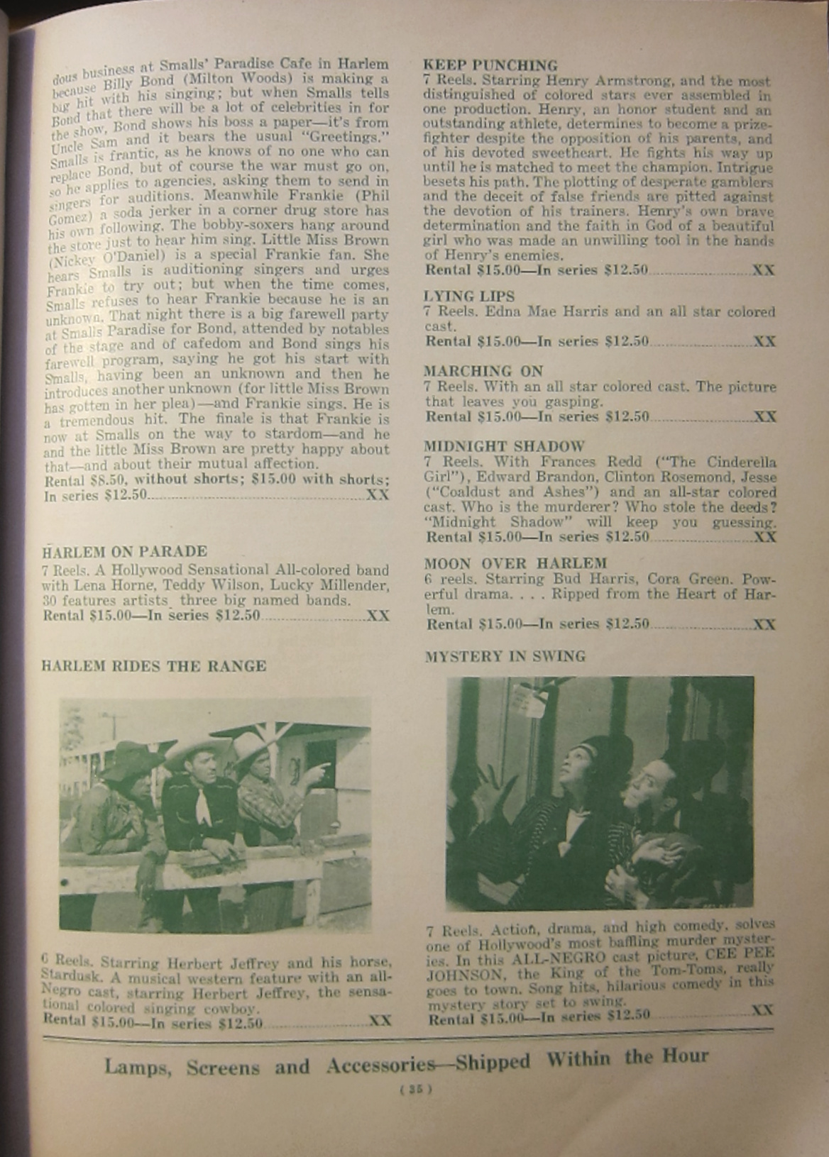 The “All Negro” offerings (no films in the catalog are dated) included 37 features ranging from 1931-1944, with ten in the 1930's and three in the 1940's. Only 12 of these are referenced in full on the Separate Cinema site, with four others tangentially mentioned and dated. There are then two pages of shorter, movies including: Short Subjects (14 films), "1-Reel All-Negro Cast Subjects (16 films), "Features with Prominent Negroes..." (4 films), "Cabin Kid Comedies" (8 1-reel films), "Musicals" (9 1-reel), "Joe Louis Fights" (9 1&2-reel films), and "Spice of Your Program" (3 2-reels).