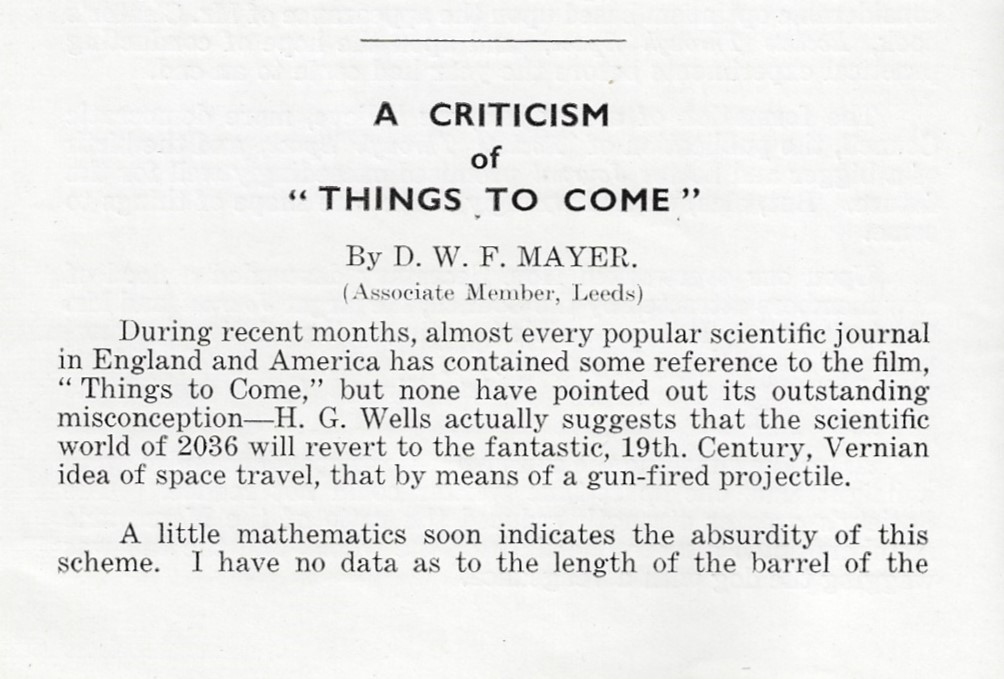 In any event D.W.F. Mayer registered his objections to the Wells spaceship in the Journal of the British Interplanetary Society from February 1937, which you can read below.
