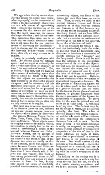 "Space is precisely analogous with time. By objects alone we estimate space; and we might as rationally define it “the succession of objects,” as time “the succession of events.” But, as before. — The fact, that we have no other means of estimating space than objects afford us — tends to the false idea that objects are space — that the more numerous the objects the greater the space; and the converse; and this erroneous impression we should receive in all cases, but for our practical means of correcting it — such as yard measures, and other conventional measures, which resolve themselves, ultimately, into certain natural standards, such as barley-corns, which, after all, we only assume to be regular."