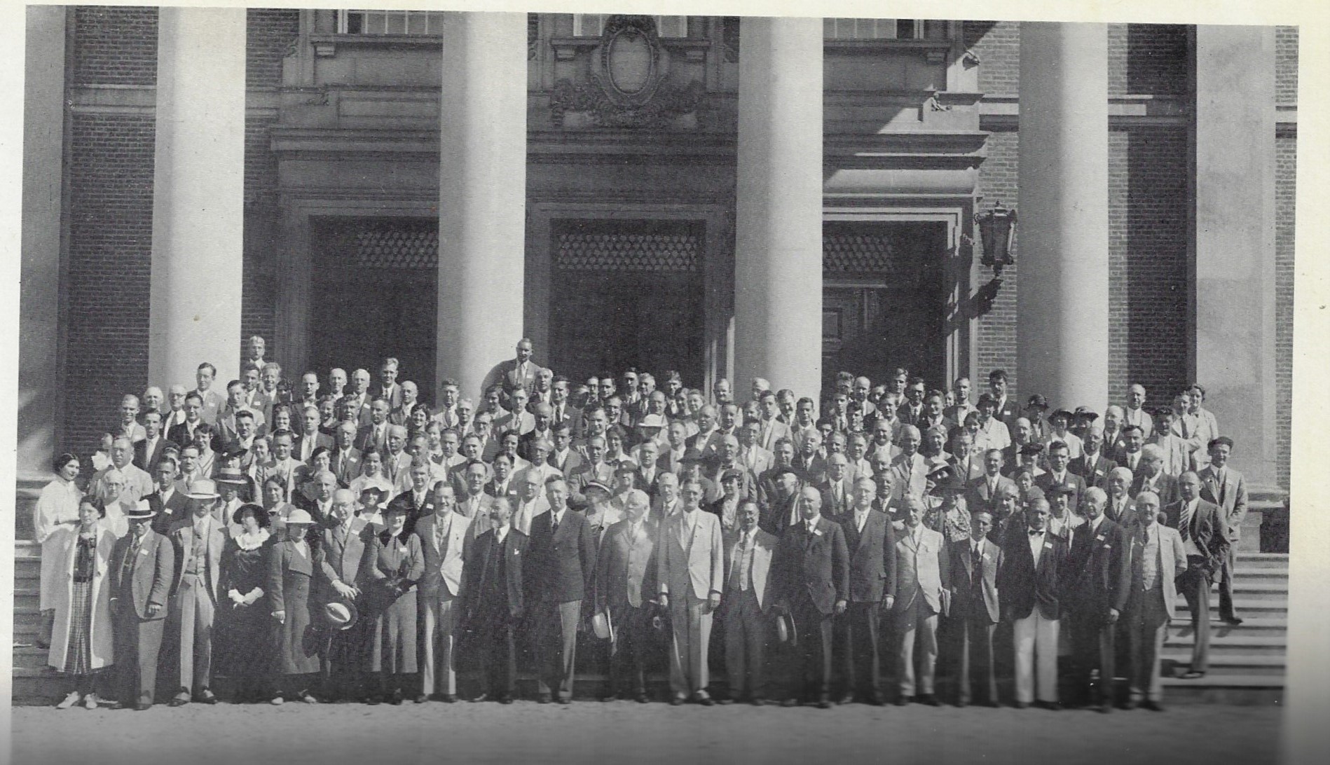 There is a longish thread on this blog about Blank, Empty, and Missing Things: faces, ethics, beginnings, ends, causes, effects, insight, wisdom, clouds, blood, smoke, rain, depth, height, and so on. There are also several posts that look a lot like today's entry--one was for astronomers, and another for mining execs from the 19th century, which was a particularly peculiar image because the head outlines had no faces though most did have moustaches and beards. Today's bit is for mathematicians attending the 18th summer meeting of the Mathematical Association of America in 1934, and I found it somewhat ironic that there would be no outlines of the bodies at all, just numbers. Perhaps this is more appropriate than ironic. In any event, here's the glassine overlay: