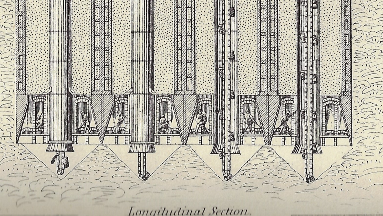 There have been a number of posts to this blog on "Bad Places to Be"--that is, very unpleasant surrounds in which someone was working, or found themselves to be. For example, sappers digging under opposing sapper's tunnels to place explosive charges under trenchworks, or being in a tiny observation gondola let on a cable suspended from a dirigible, or digging a tunnel, or being a U-Boat crew member in late 1943, and so on. And then there's the impossible scenario of being the man with the job of crawling through the burnt and enormous timbers of the Brooklyn 'Bridge's east caisson, crawling though tiny spaces to chisel out damaged sections of the gigantic woodworks upon which tons of rock were placed, and doing this in mostly the dark and underwater. Really, quite incredible. But then again it was a terrifically difficult and dangerous job to be a workman anywhere in those caissons--the environment was dank, dark, fetid, muddy, slippery, hot, and on top of it all, crowded. And so to today's issue: the building of the pier for Kehl Bridge, found in the July 1868 issue of Journal of the Franklin Institute. It was quite a massive undertaking, and of course my eye is drawn immediately to the bottom of the image, where the men with the most impossible jobs labored. Here's the detail: