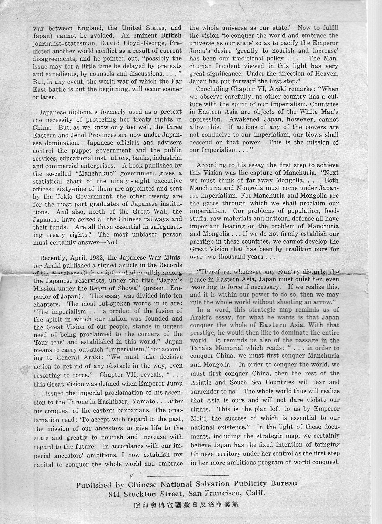 This is a piece of anti-Japanese propaganda coming from the KMT, and it is published by the Chinese National Salvation Publicity Bureau (844 Stockton Street, which looks today like it is the Sun Yat-Sen Memorial Hall) in San Francisco, After all, the Japanese had been savaging around in China on and off since the First Sino-Japanese War at the end of the century, and then again heating things up in the early 'thirties with the Japanese-instigated the Shanghai War and the invasion of Manchuria--the Chinese no doubt were seeking allies wherever they could them.